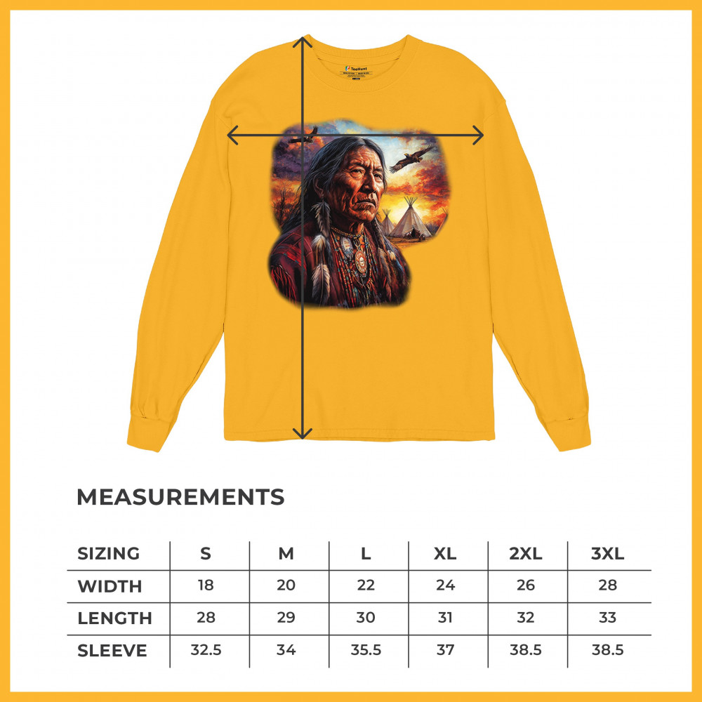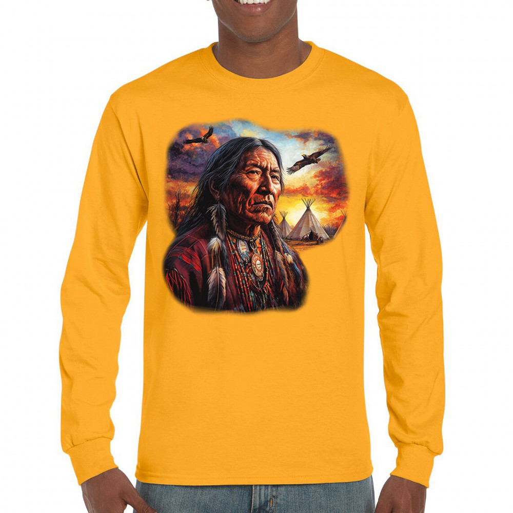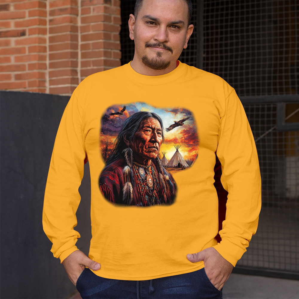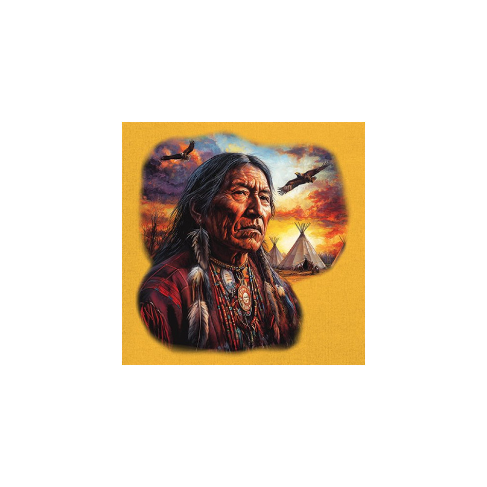 Native elder, teepees, sunset, and eagles come together in this spiritual design celebrating indigenous culture, heritage, and nature’s beauty.