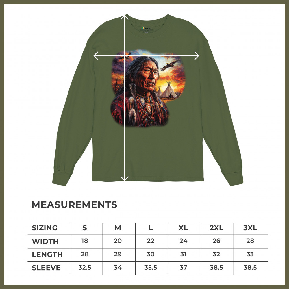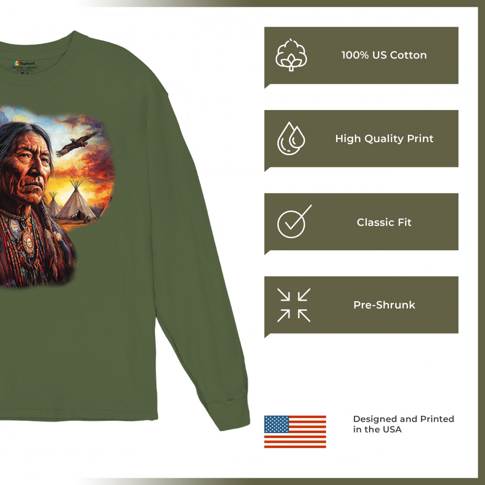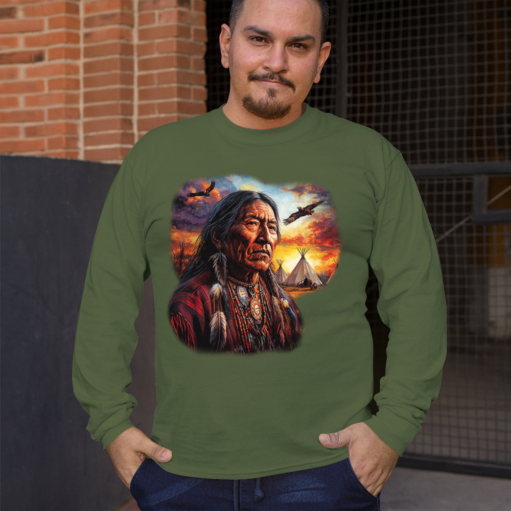 This vivid artwork features a Native American elder in traditional feathered attire, set before a blazing sunset with soaring eagles and peaceful teepees. The scene symbolizes strength, heritage, and spiritual wisdom. A heartfelt tribute to tribal pride, ancestral legacy, and cultural connection to land.
