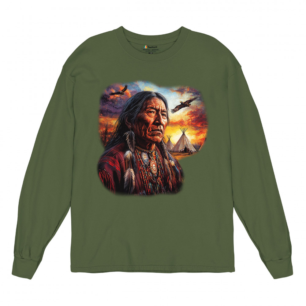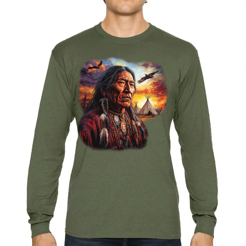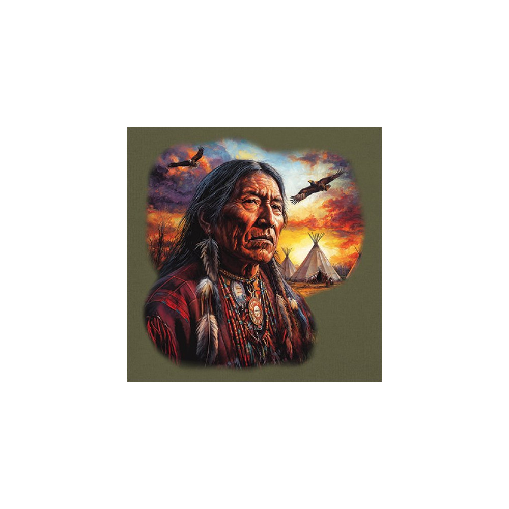 Native elder, teepees, sunset, and eagles come together in this spiritual design celebrating indigenous culture, heritage, and nature’s beauty.