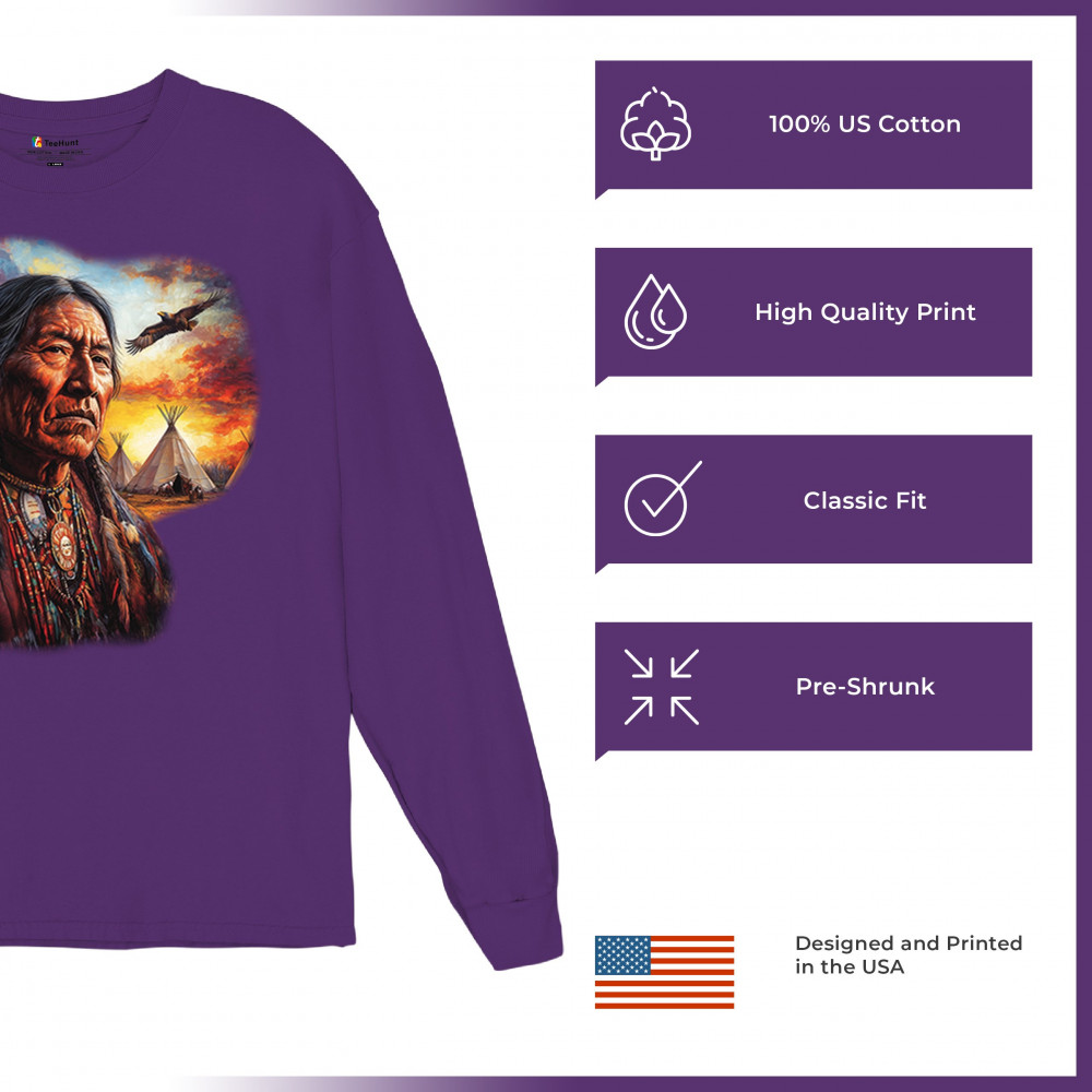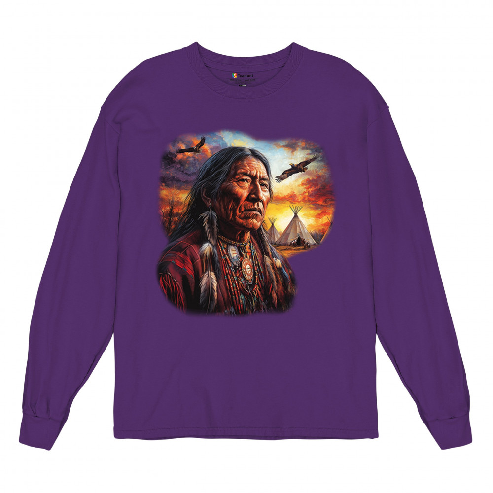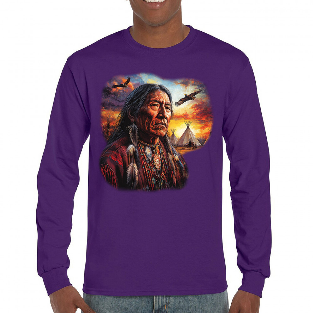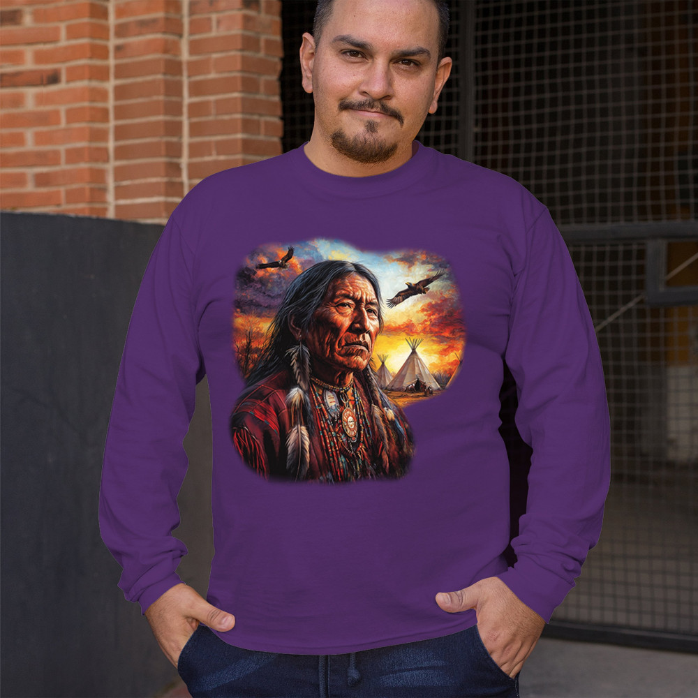 Native elder, teepees, sunset, and eagles come together in this spiritual design celebrating indigenous culture, heritage, and nature’s beauty.