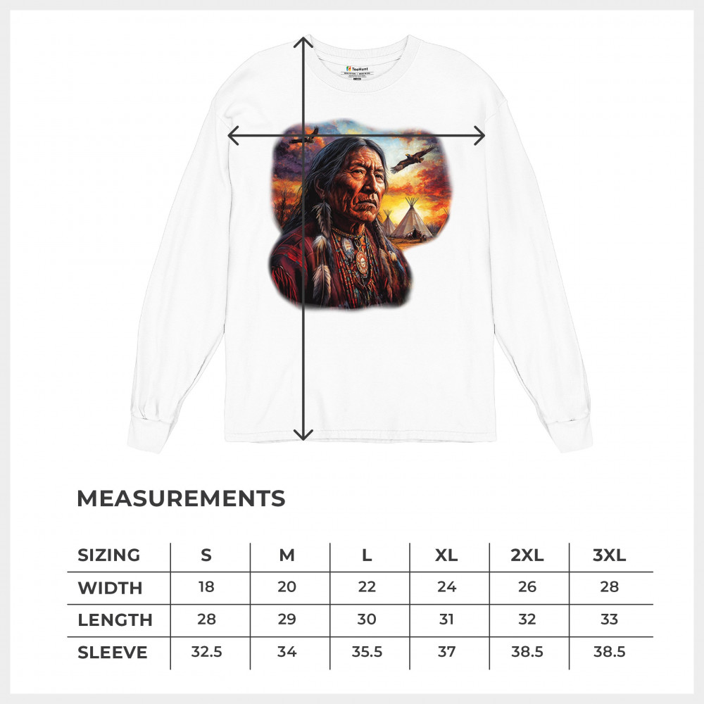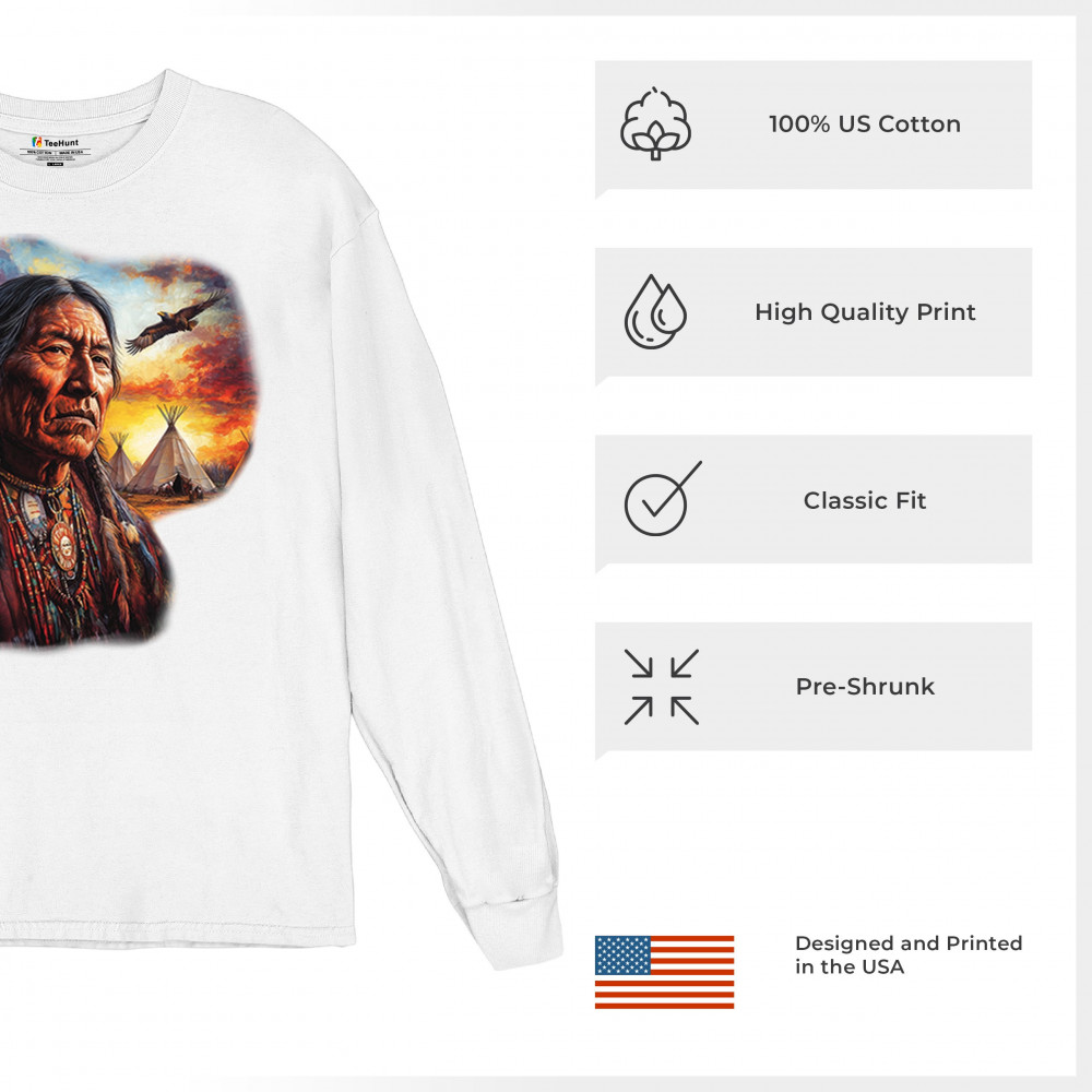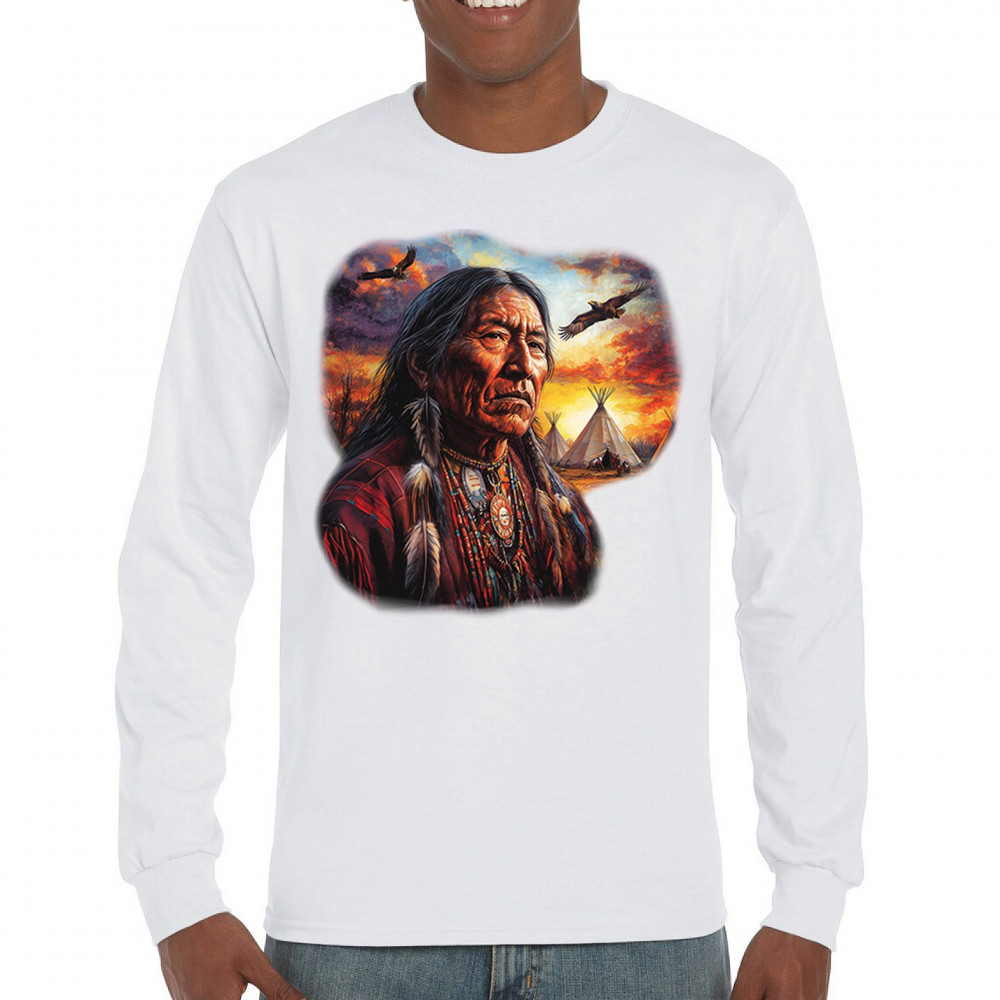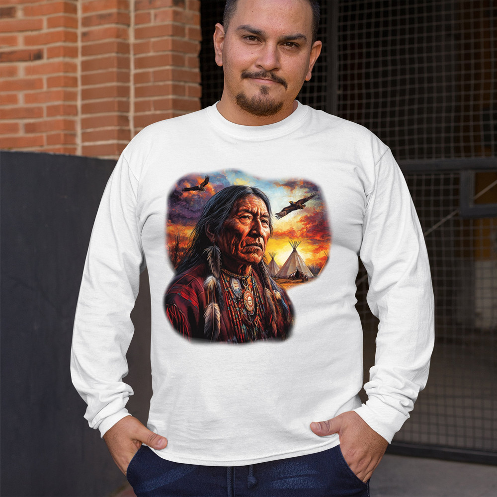 Native elder, teepees, sunset, and eagles come together in this spiritual design celebrating indigenous culture, heritage, and nature’s beauty.