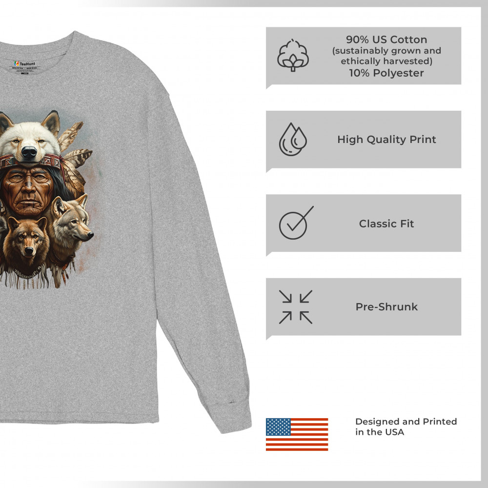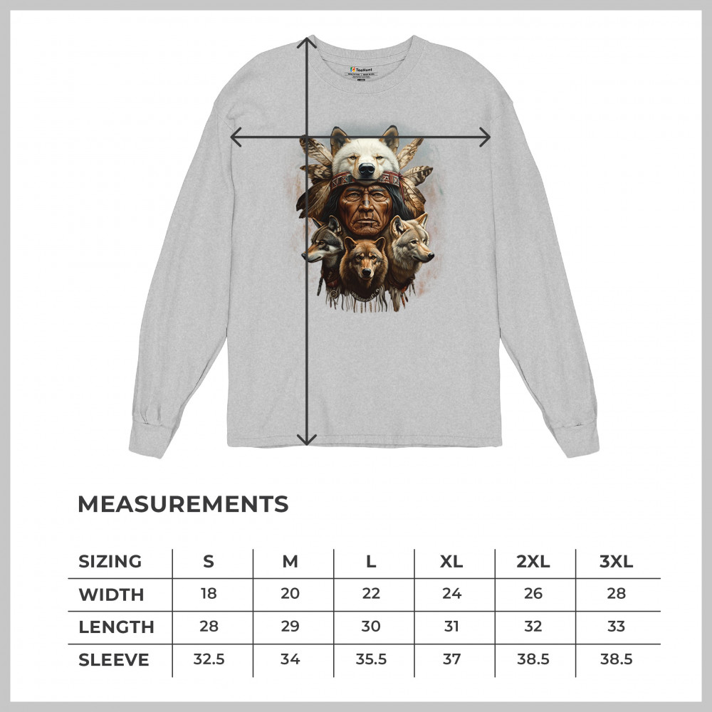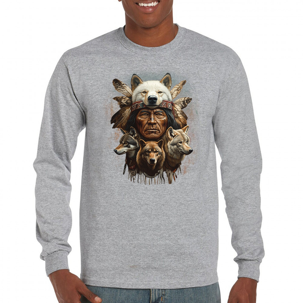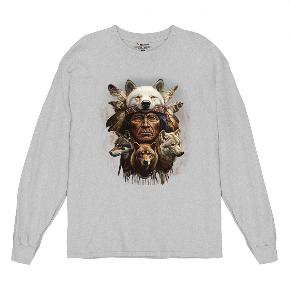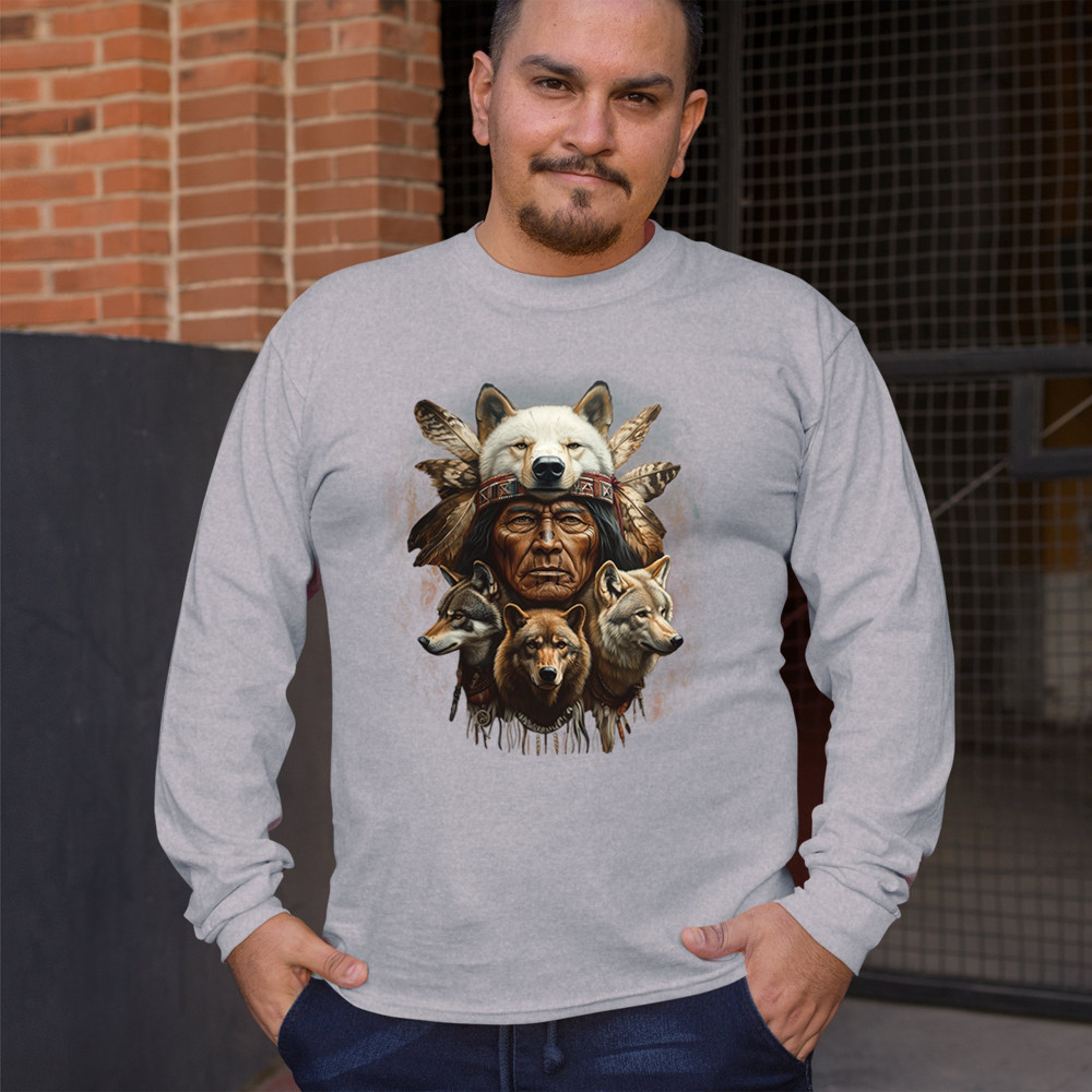Wolf totem design with Native elder in headdress and guardian wolves. Symbolizes strength, loyalty, spirit animals, and tribal heritage.