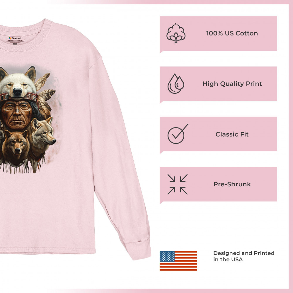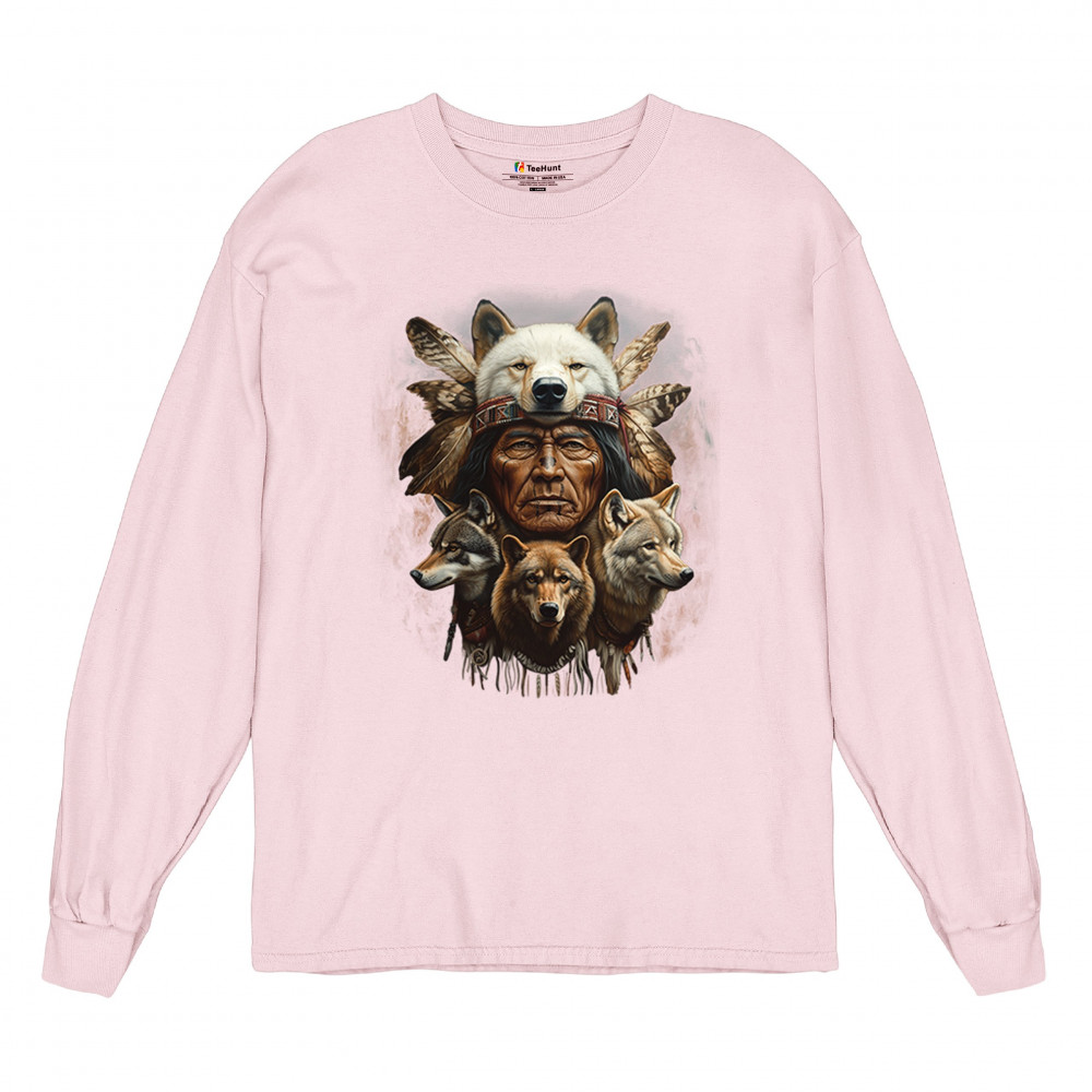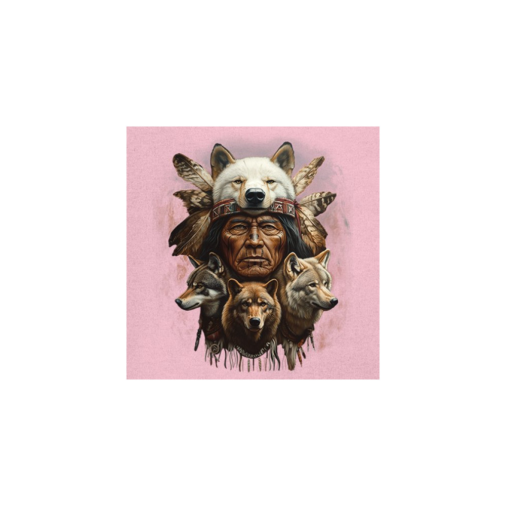 Wolf totem design with Native elder in headdress and guardian wolves. Symbolizes strength, loyalty, spirit animals, and tribal heritage.