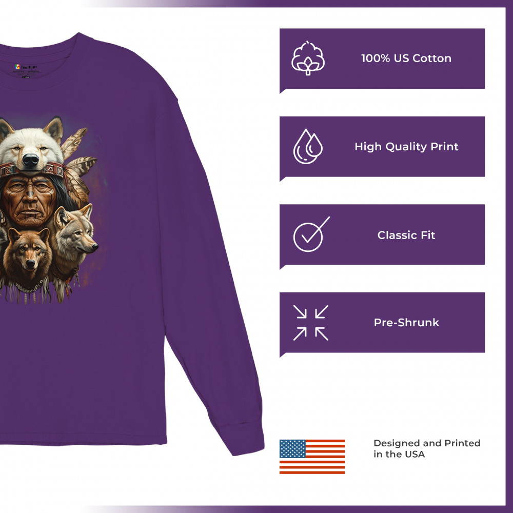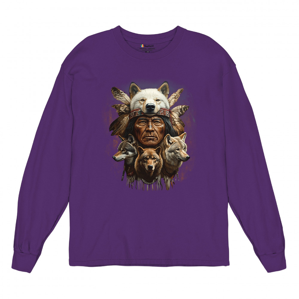 Wolf totem design with Native elder in headdress and guardian wolves. Symbolizes strength, loyalty, spirit animals, and tribal heritage.