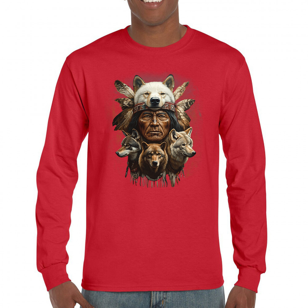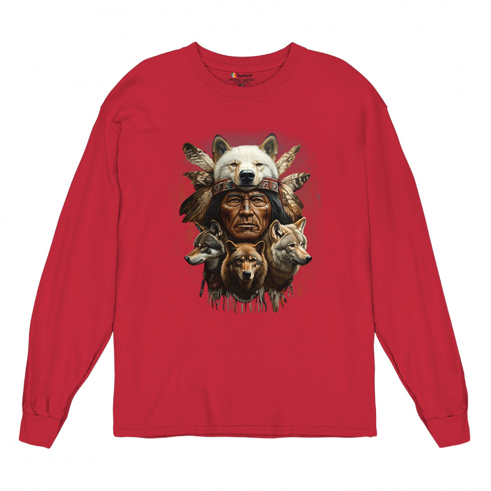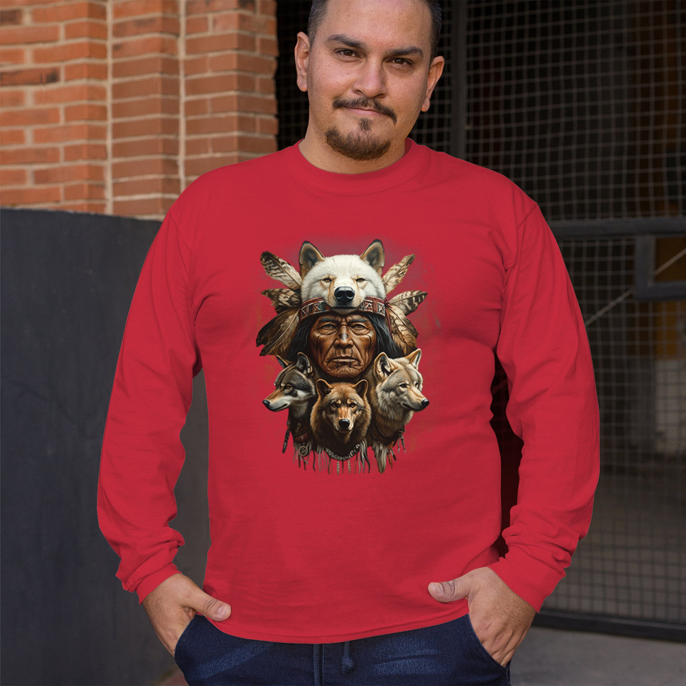Wolf totem design with Native elder in headdress and guardian wolves. Symbolizes strength, loyalty, spirit animals, and tribal heritage.