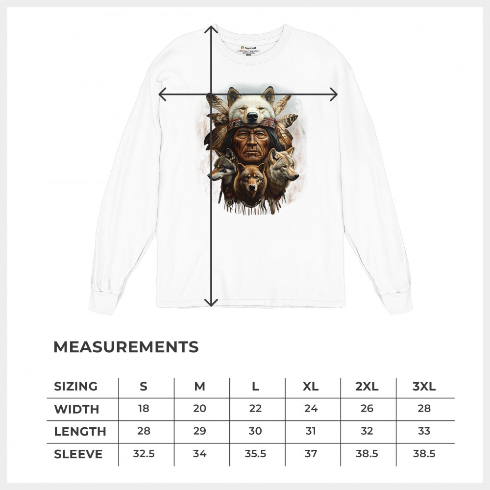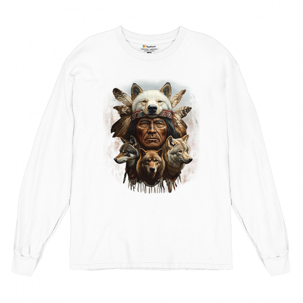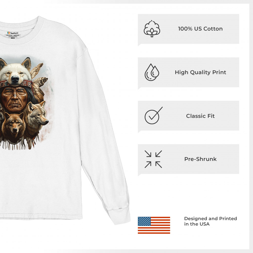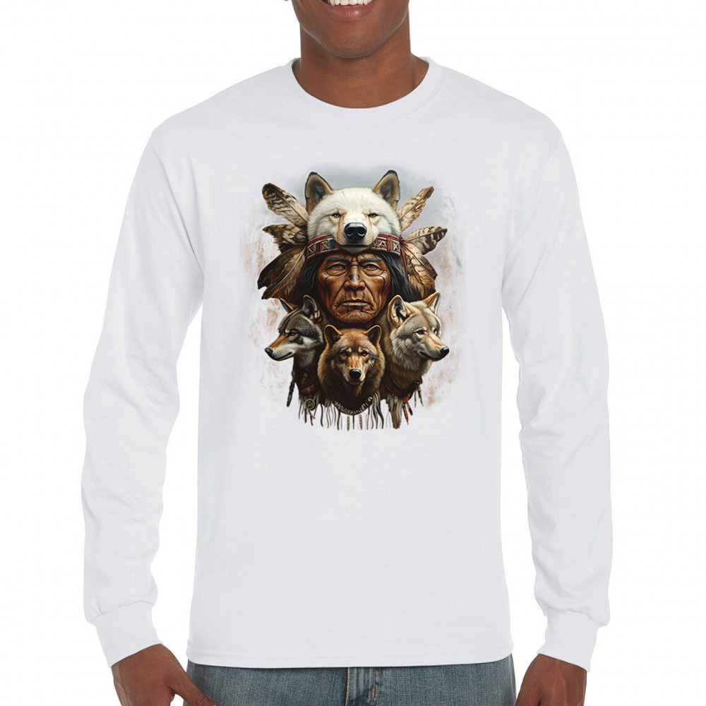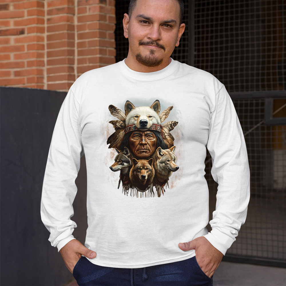 Wolf totem design with Native elder in headdress and guardian wolves. Symbolizes strength, loyalty, spirit animals, and tribal heritage.