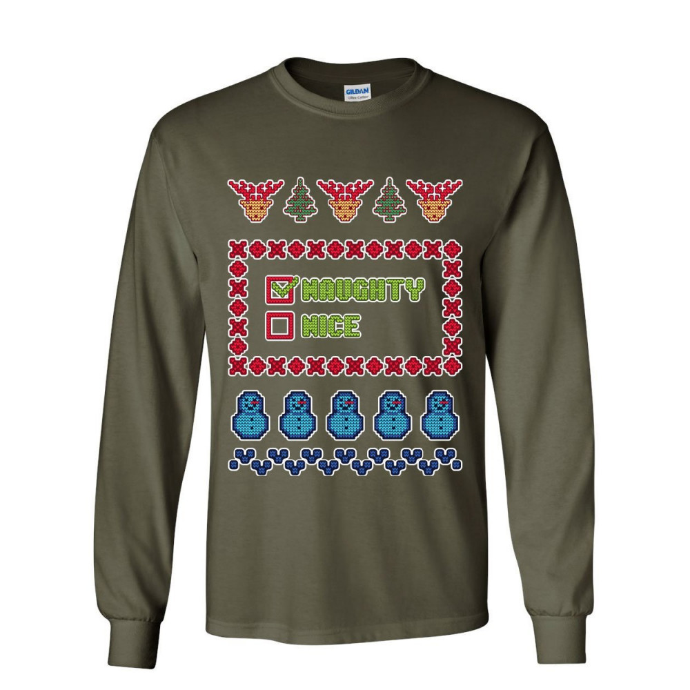 NAUGHTY OR NICE ugly sweater long sleeve t-shirt christmas xmas holiday list tee military green