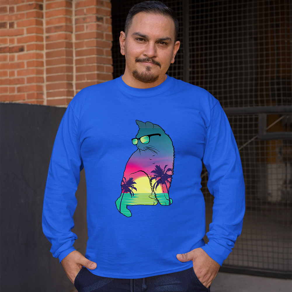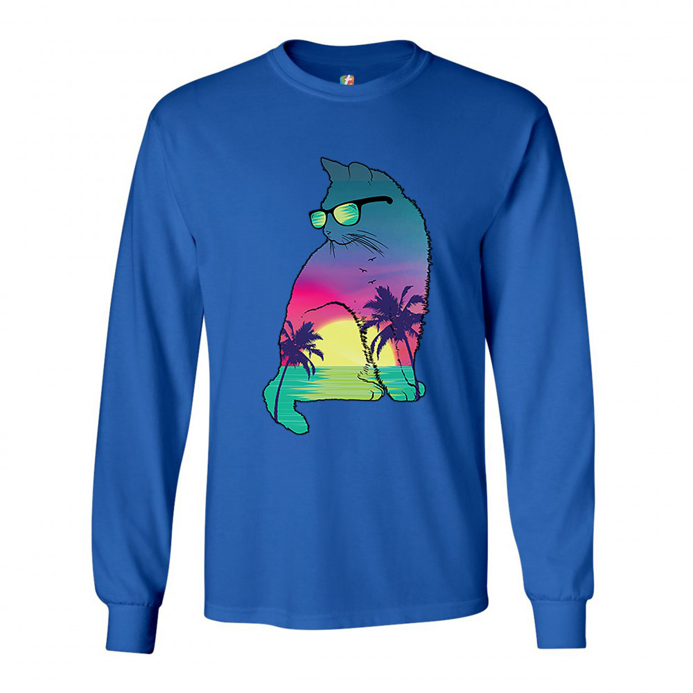 NEON CAT IN SUNGLASSES long sleeve t-shirt tropic kitten summer beach kitty royal blue