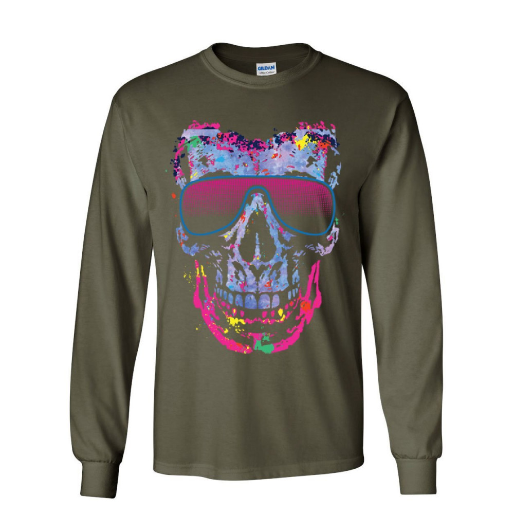 NEON SKULL SUNGLASSES long sleeve t-shirt swag multicolor music edm rave pop tee military green