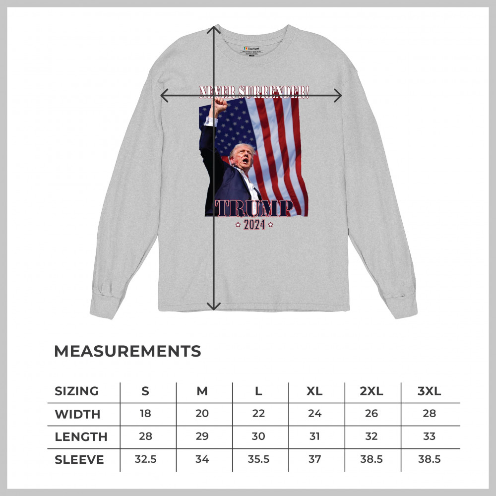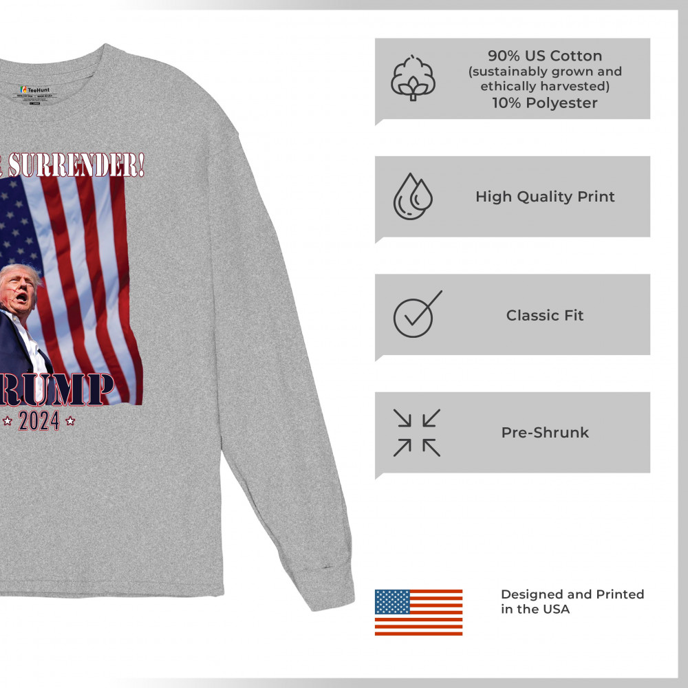 Support Donald Trump with our bold "Never Surrender! Trump 2024" design, featuring Trump against the American flag. Perfect for rallies and everyday wear.