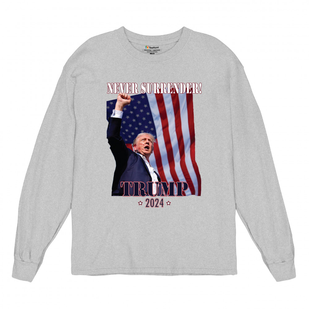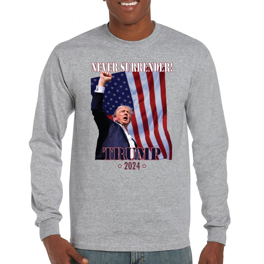 Celebrate your patriotic spirit and political stance with our "Never Surrender! Trump 2024" design. This powerful graphic showcases Donald Trump with a raised fist against the backdrop of the American flag, symbolizing resilience and determination. Ideal for rallies, events, and everyday wear, this design is crafted from premium materials for comfort and durability. Stand out and show your support for America's future with this striking and bold statement piece, perfect for any proud Trump supporter.