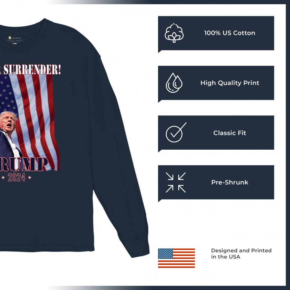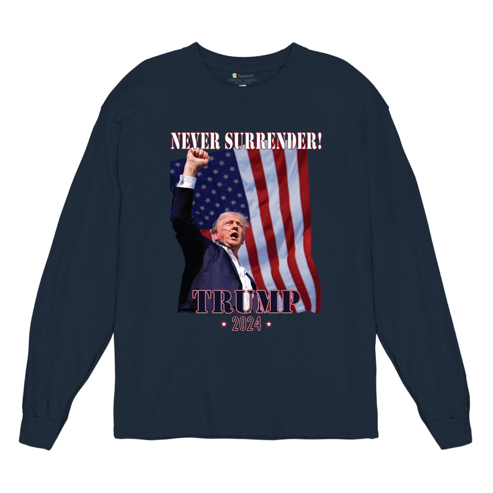 Support Donald Trump with our bold "Never Surrender! Trump 2024" design, featuring Trump against the American flag. Perfect for rallies and everyday wear.