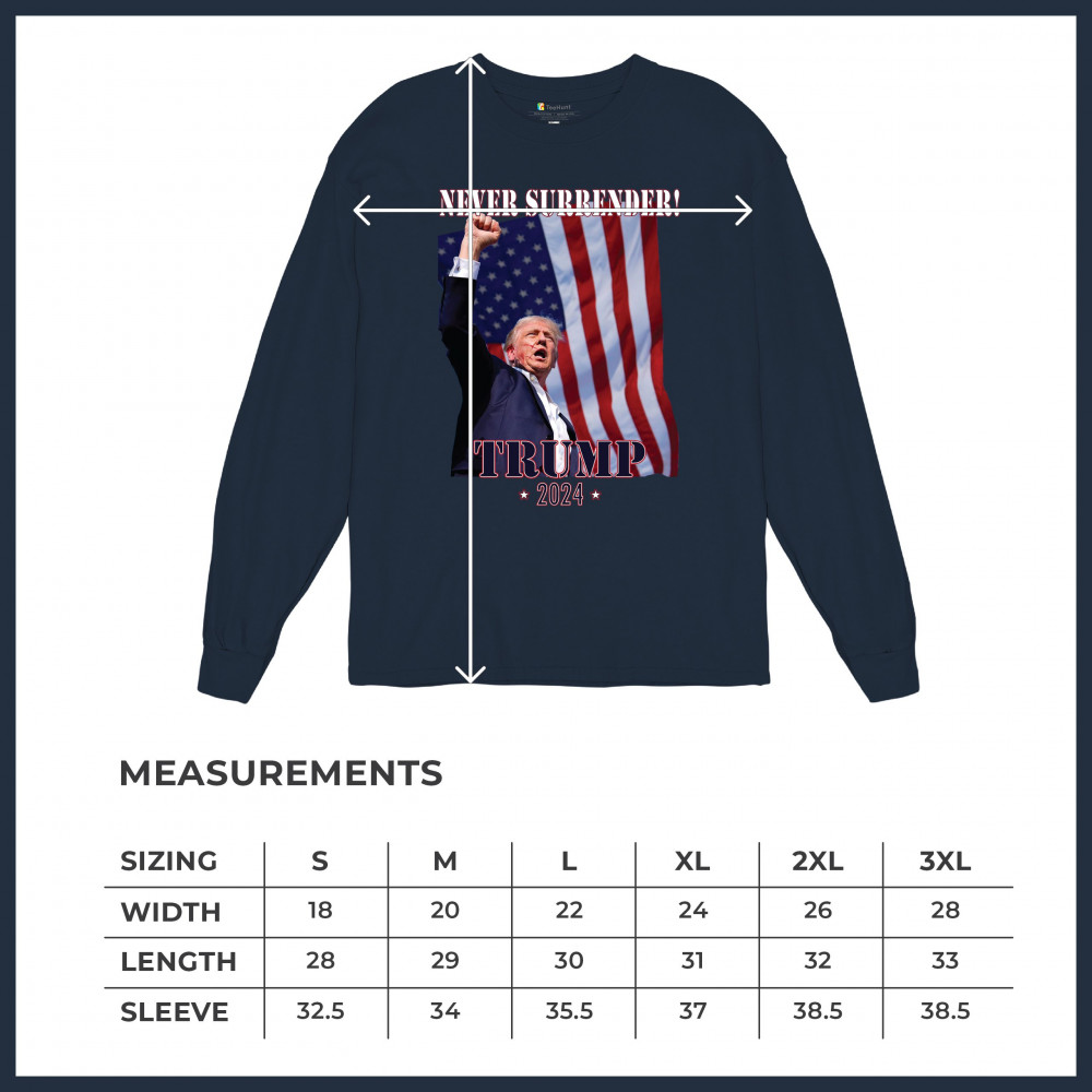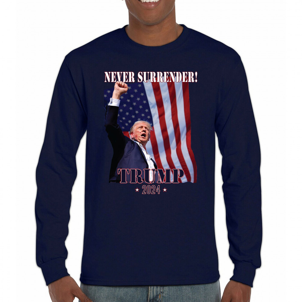 Celebrate your patriotic spirit and political stance with our "Never Surrender! Trump 2024" design. This powerful graphic showcases Donald Trump with a raised fist against the backdrop of the American flag, symbolizing resilience and determination. Ideal for rallies, events, and everyday wear, this design is crafted from premium materials for comfort and durability. Stand out and show your support for America's future with this striking and bold statement piece, perfect for any proud Trump supporter.