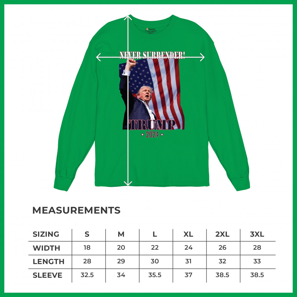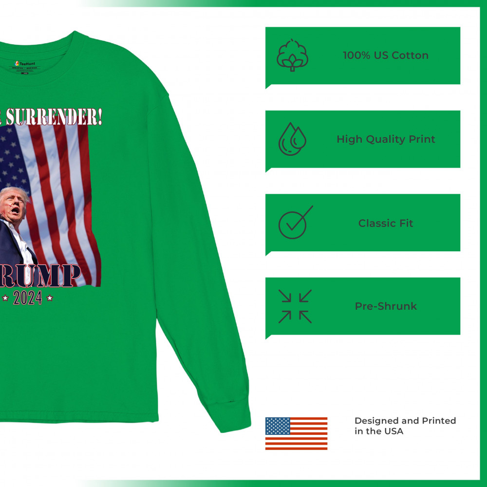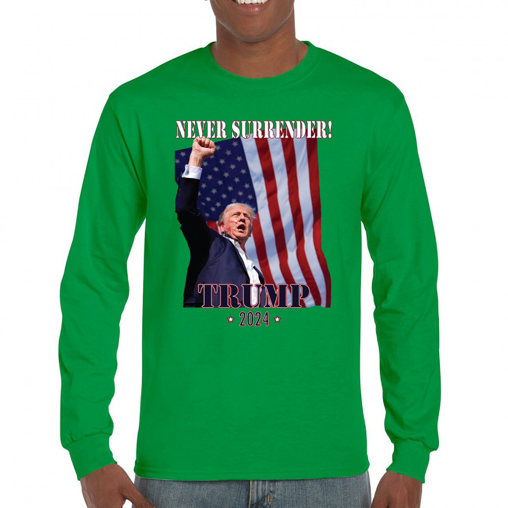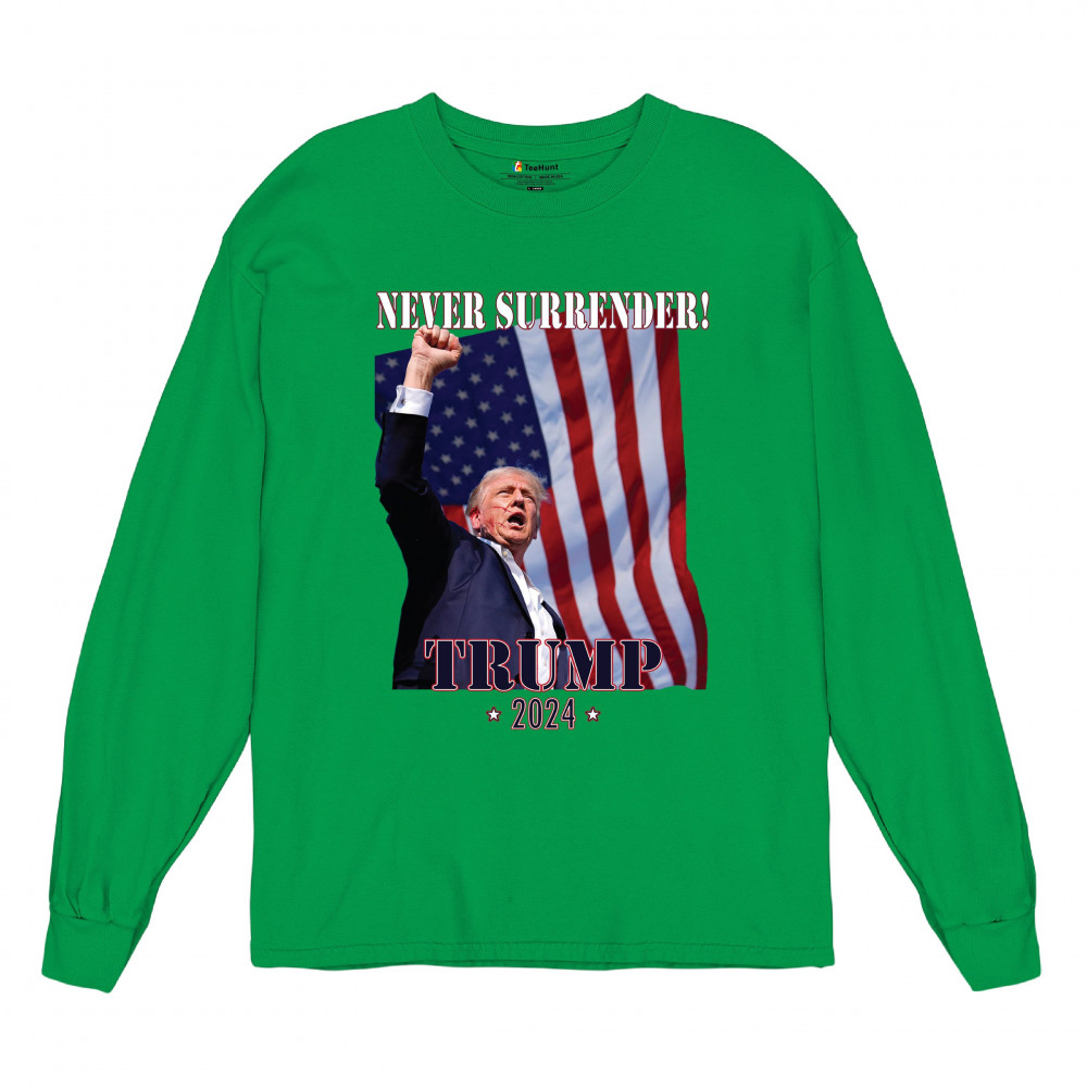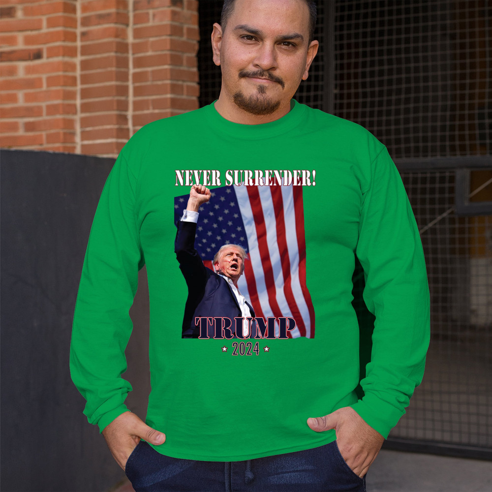 Support Donald Trump with our bold "Never Surrender! Trump 2024" design, featuring Trump against the American flag. Perfect for rallies and everyday wear.