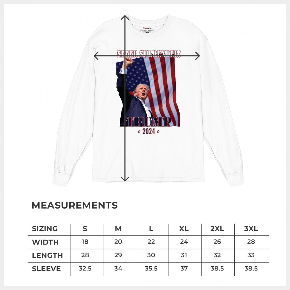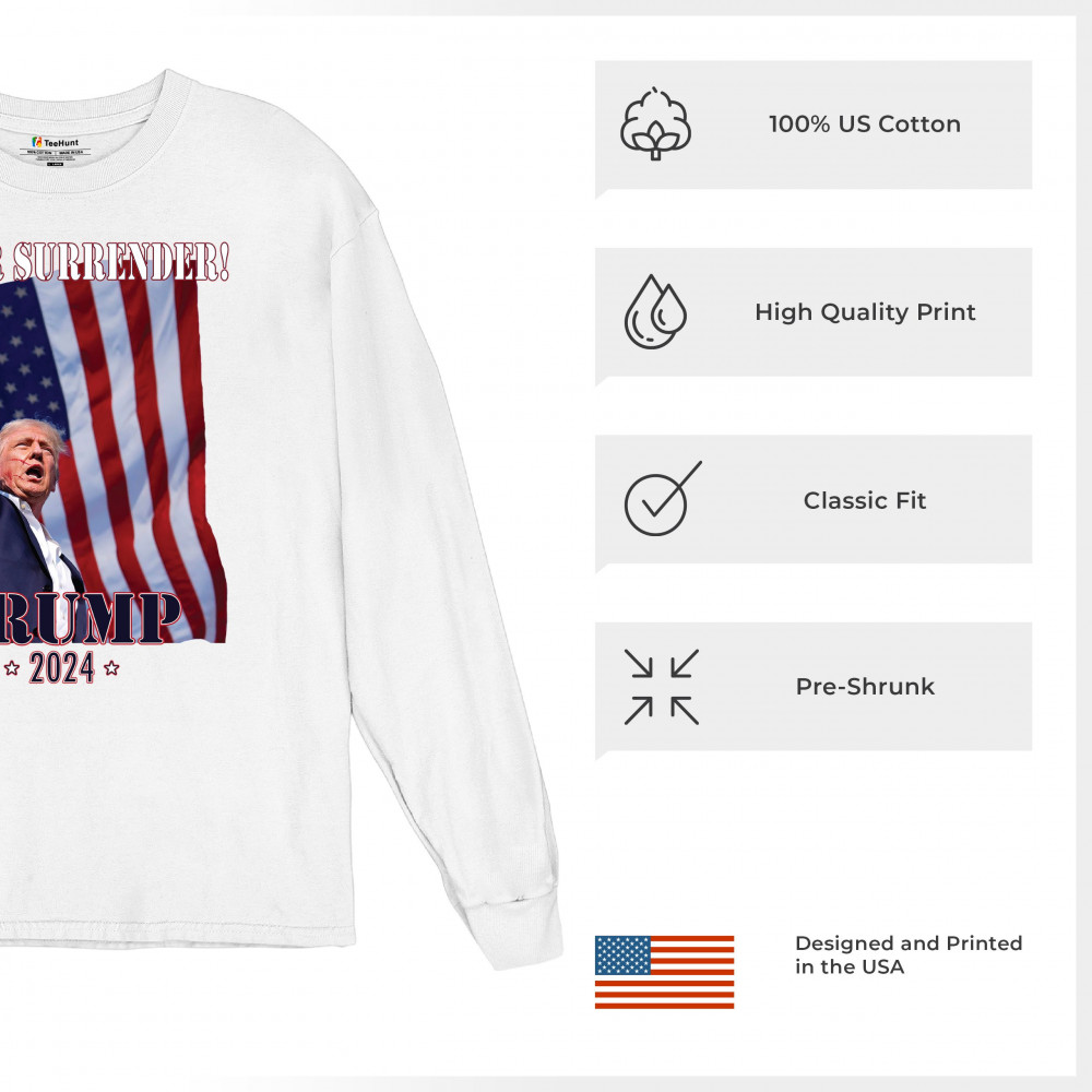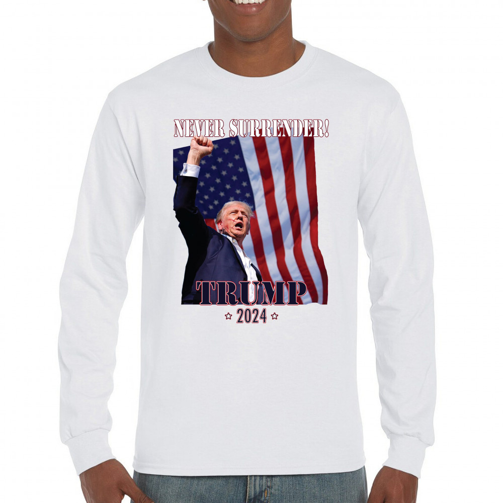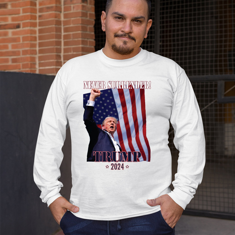 Support Donald Trump with our bold "Never Surrender! Trump 2024" design, featuring Trump against the American flag. Perfect for rallies and everyday wear.