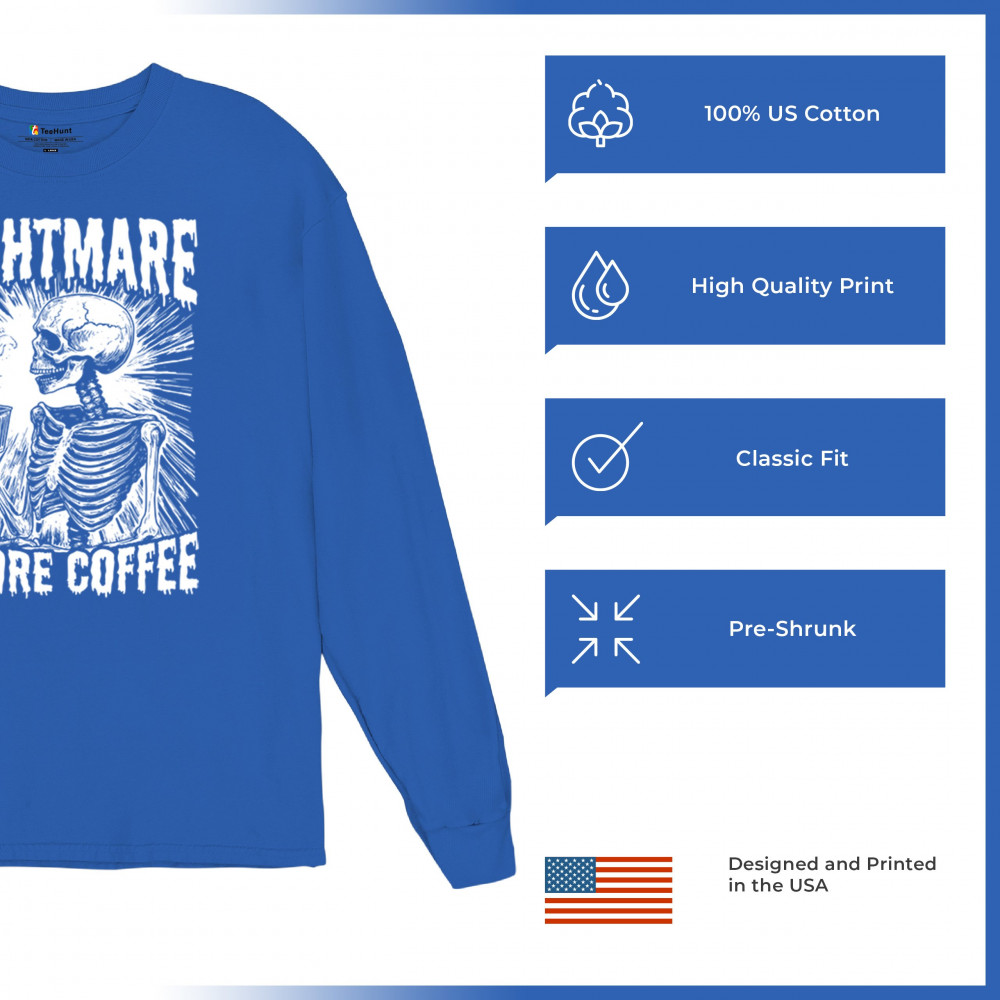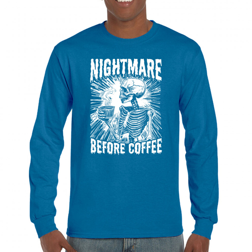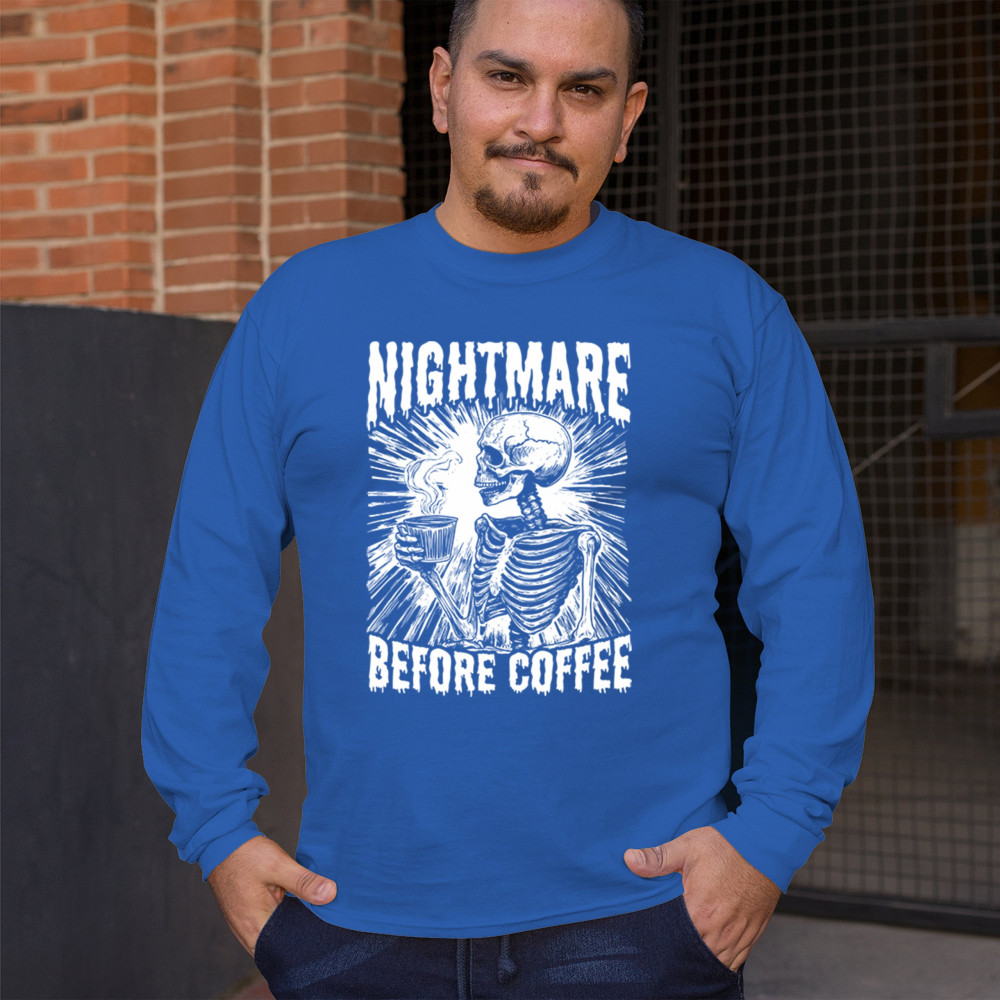 Show off your love for coffee with this quirky "Nightmare Before Coffee" skeleton design, blending humor and gothic style for caffeine lovers.