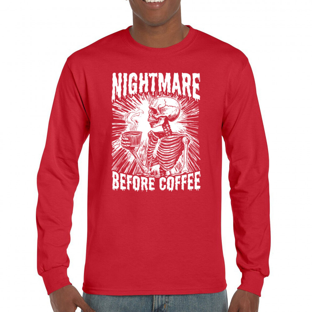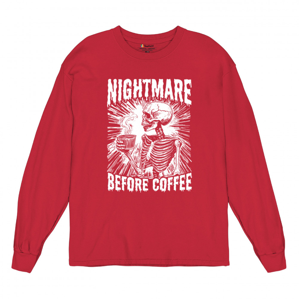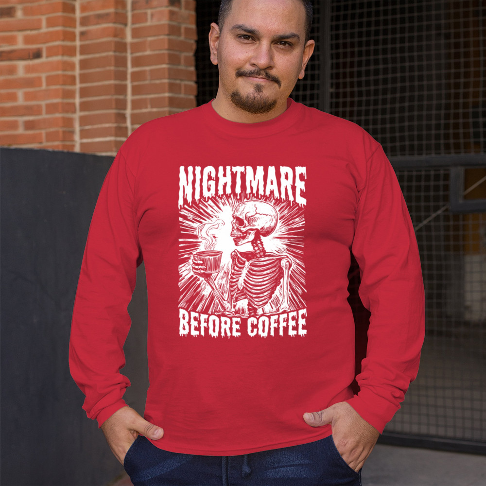 Show off your love for coffee with this quirky "Nightmare Before Coffee" skeleton design, blending humor and gothic style for caffeine lovers.