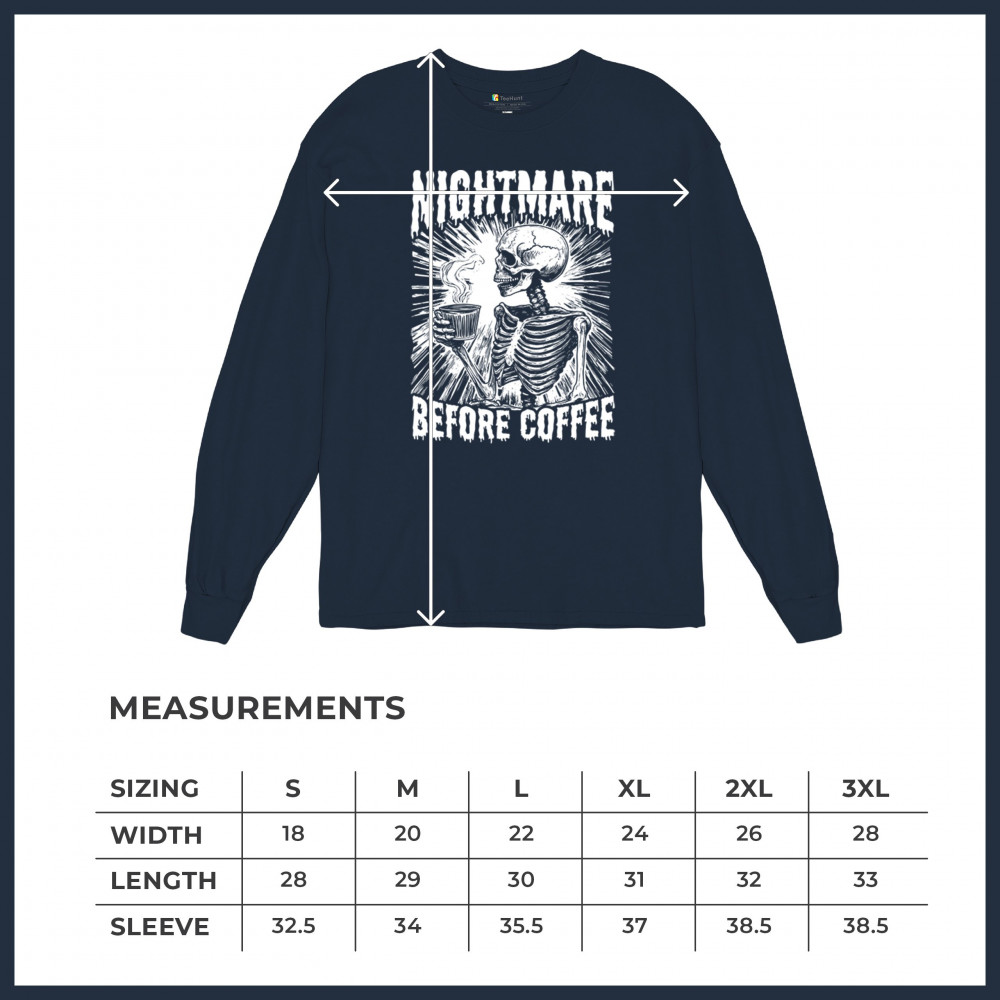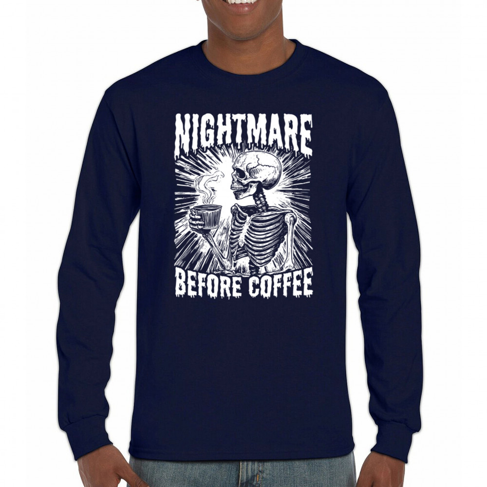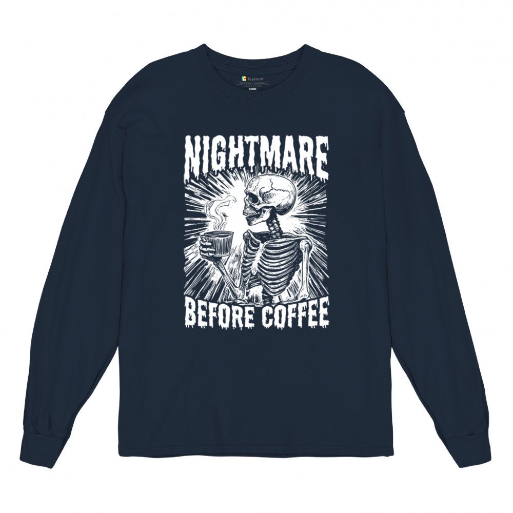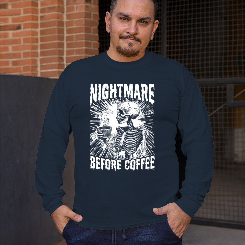 Show off your love for coffee with this quirky "Nightmare Before Coffee" skeleton design, blending humor and gothic style for caffeine lovers.
