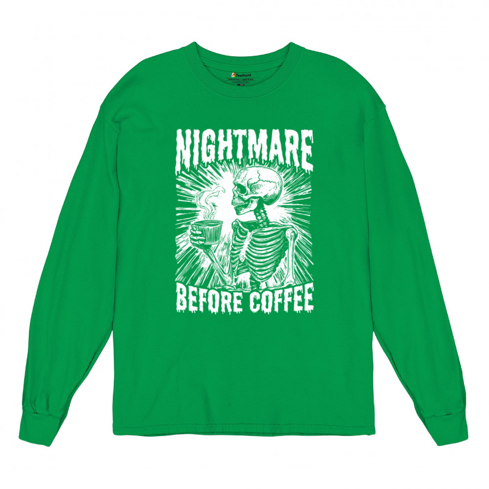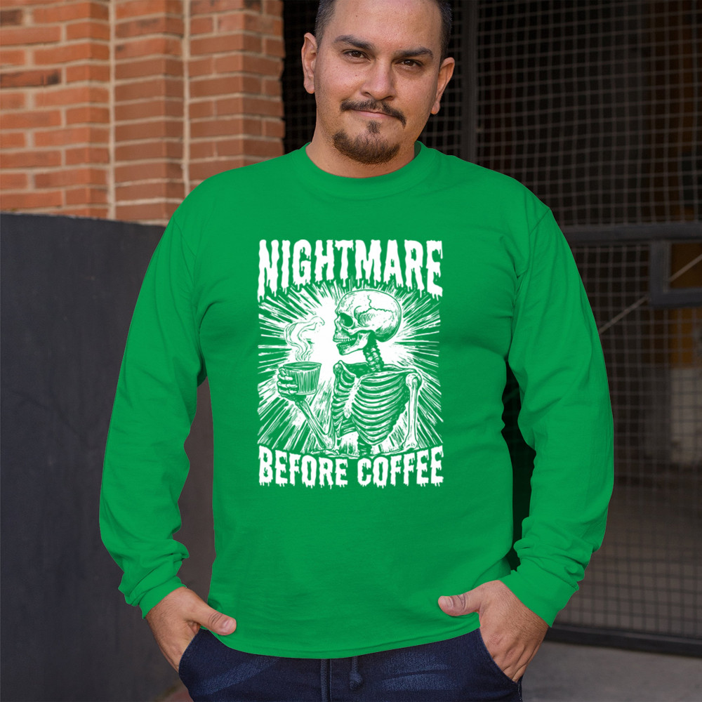 Show off your love for coffee with this quirky "Nightmare Before Coffee" skeleton design, blending humor and gothic style for caffeine lovers.