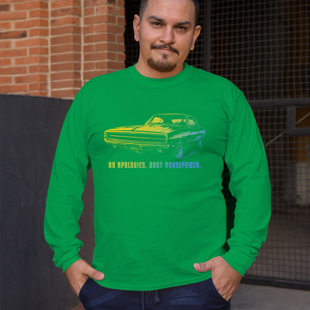 Bold 1970 muscle car design with gradient pop. No apologies, just horsepower—perfect for car shows, gearheads, and performance lovers.