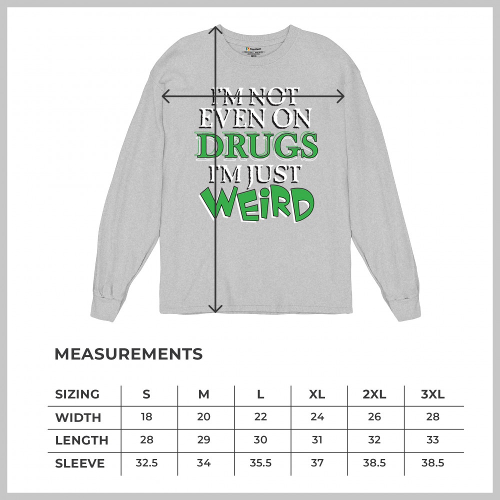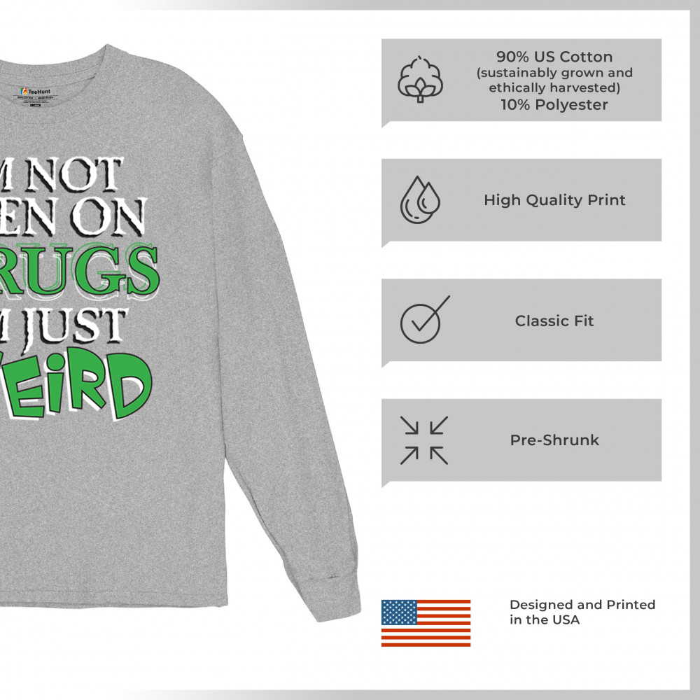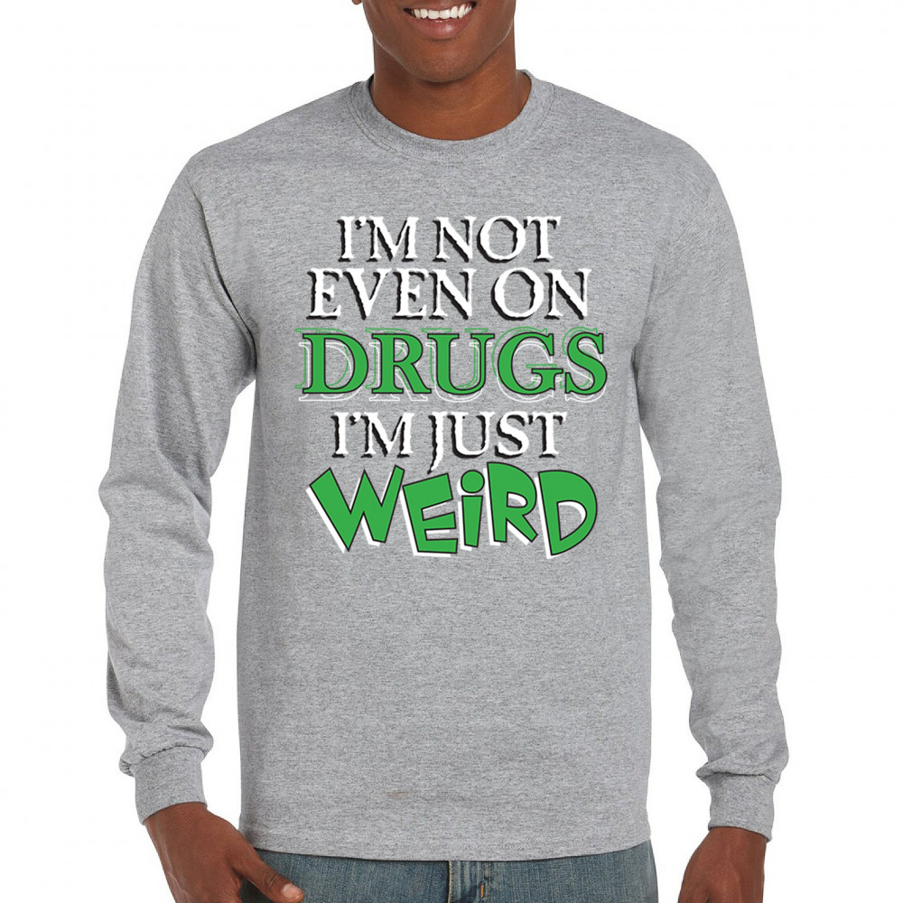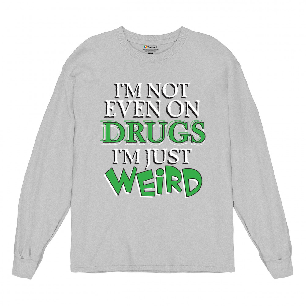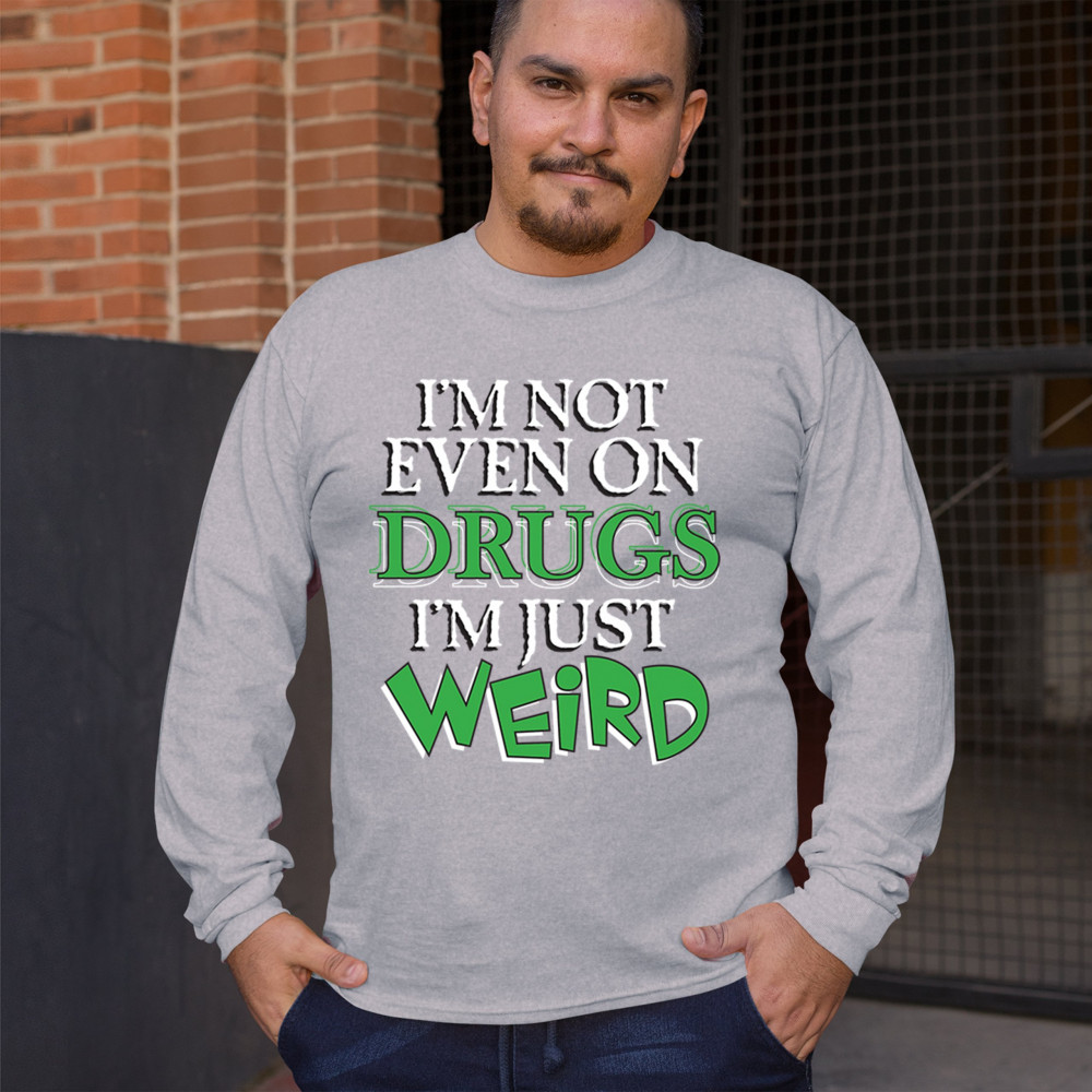 Bold weird design for introverts and quirky minds. Says “I'm not even on drugs I'm just weirdâ€â€”perfect for awkward humor and loud energy.