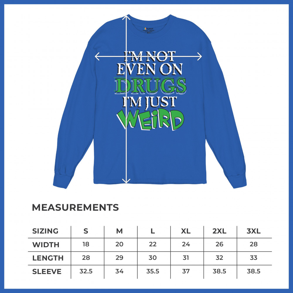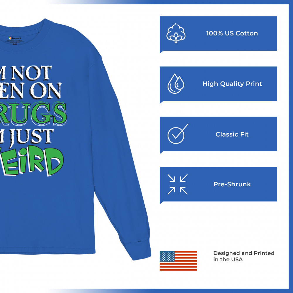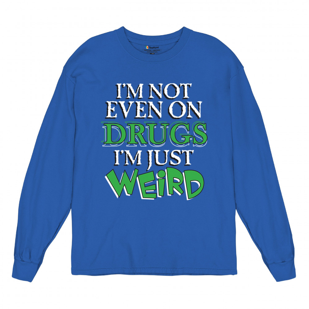 Bold weird design for introverts and quirky minds. Says “I'm not even on drugs I'm just weirdâ€â€”perfect for awkward humor and loud energy.