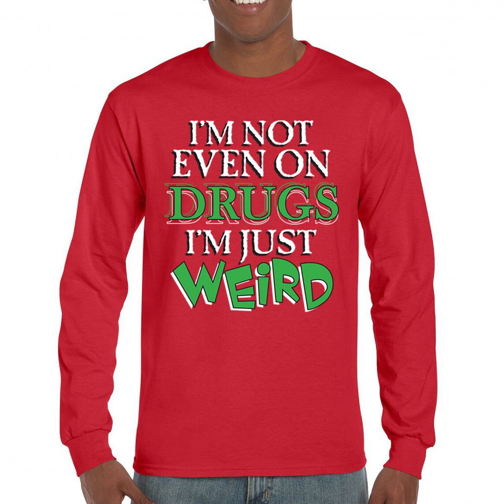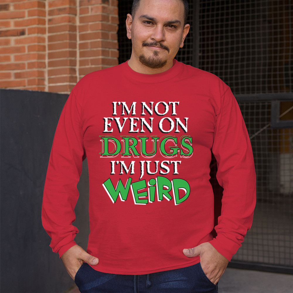 Bold weird design for introverts and quirky minds. Says “I'm not even on drugs I'm just weirdâ€â€”perfect for awkward humor and loud energy.