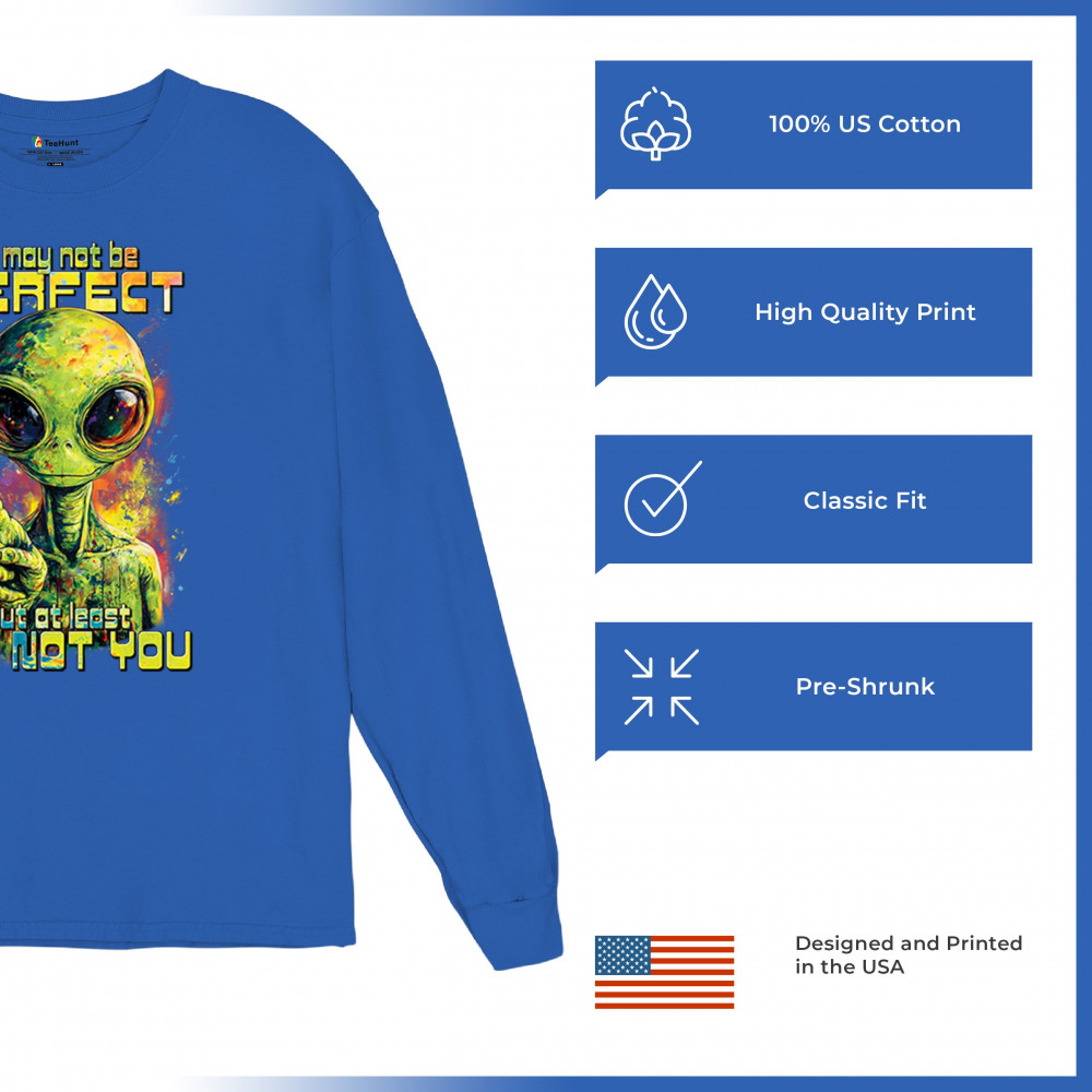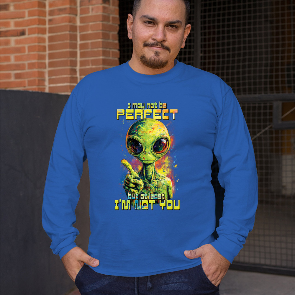 This smug alien design delivers sharp sarcastic humor with vibrant cosmic flair. Featuring a big-eyed extraterrestrial and the quote “I may not be perfect, but at least I’m not you,†it’s perfect for sci-fi fans, alien lovers, jokesters, and oddballs alike. A bold, funny statement for parties, UFO events, and festivals.