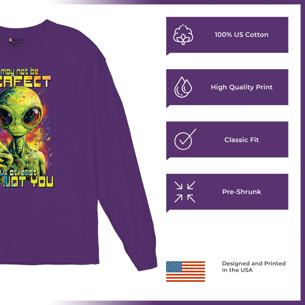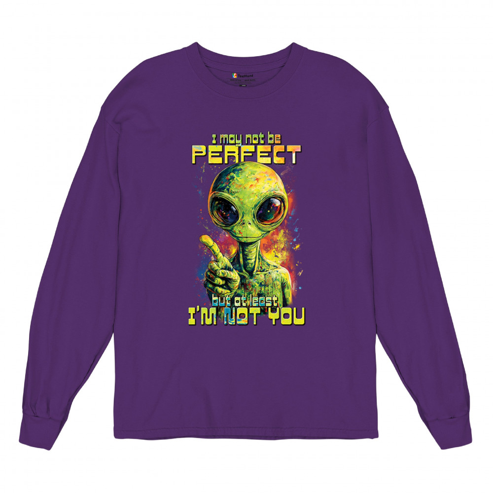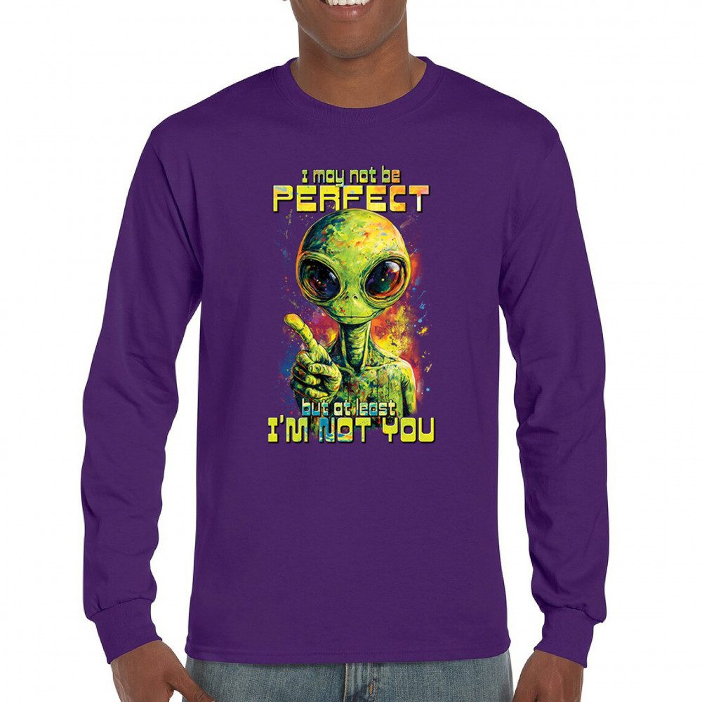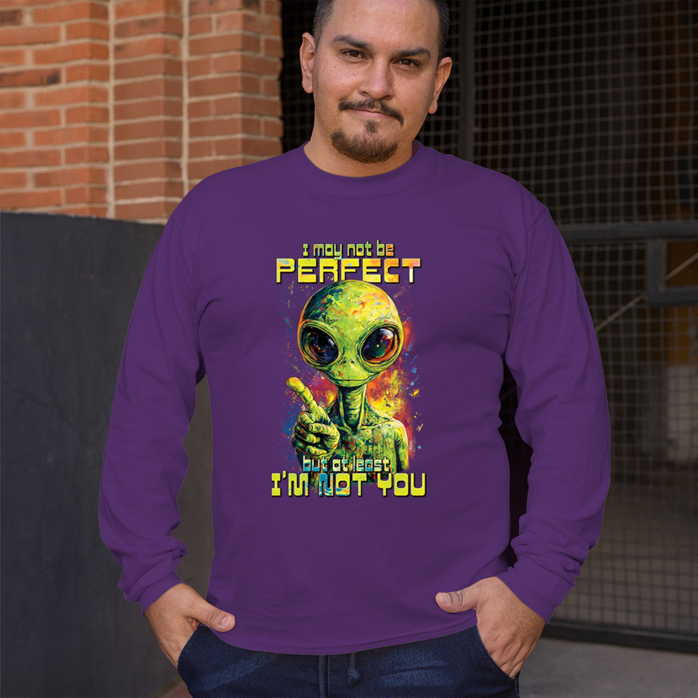 This smug alien design delivers sharp sarcastic humor with vibrant cosmic flair. Featuring a big-eyed extraterrestrial and the quote “I may not be perfect, but at least I’m not you,†it’s perfect for sci-fi fans, alien lovers, jokesters, and oddballs alike. A bold, funny statement for parties, UFO events, and festivals.