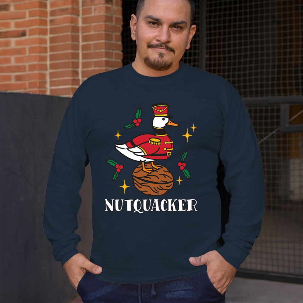 This hilarious Nutquacker design puts a festive spin on holiday humor, showcasing a duck dressed as a nutcracker standing on a walnut with holly accents and bright Christmas touches. A perfect choice for quirky gift-givers, holiday party outfits, and anyone who loves clever Christmas graphics that add personality, charm, and seasonal fun to their celebrations.