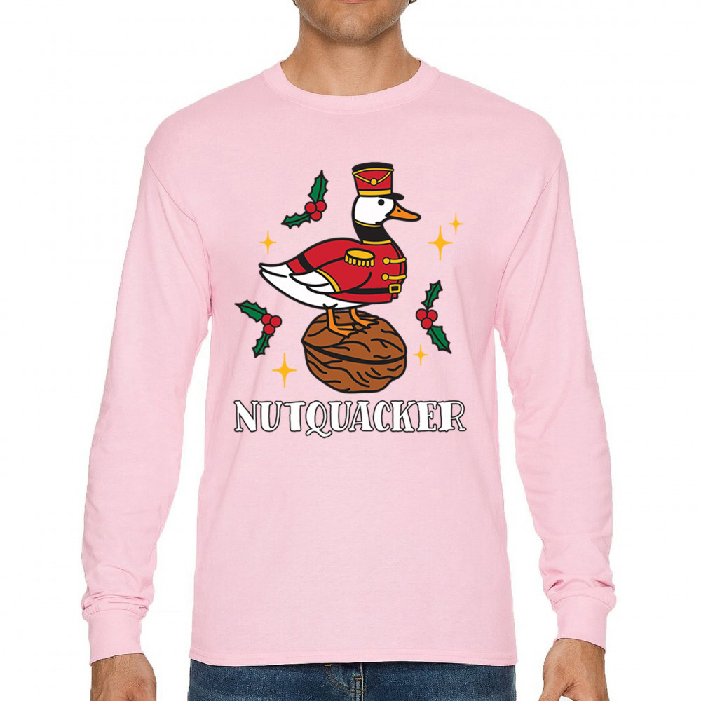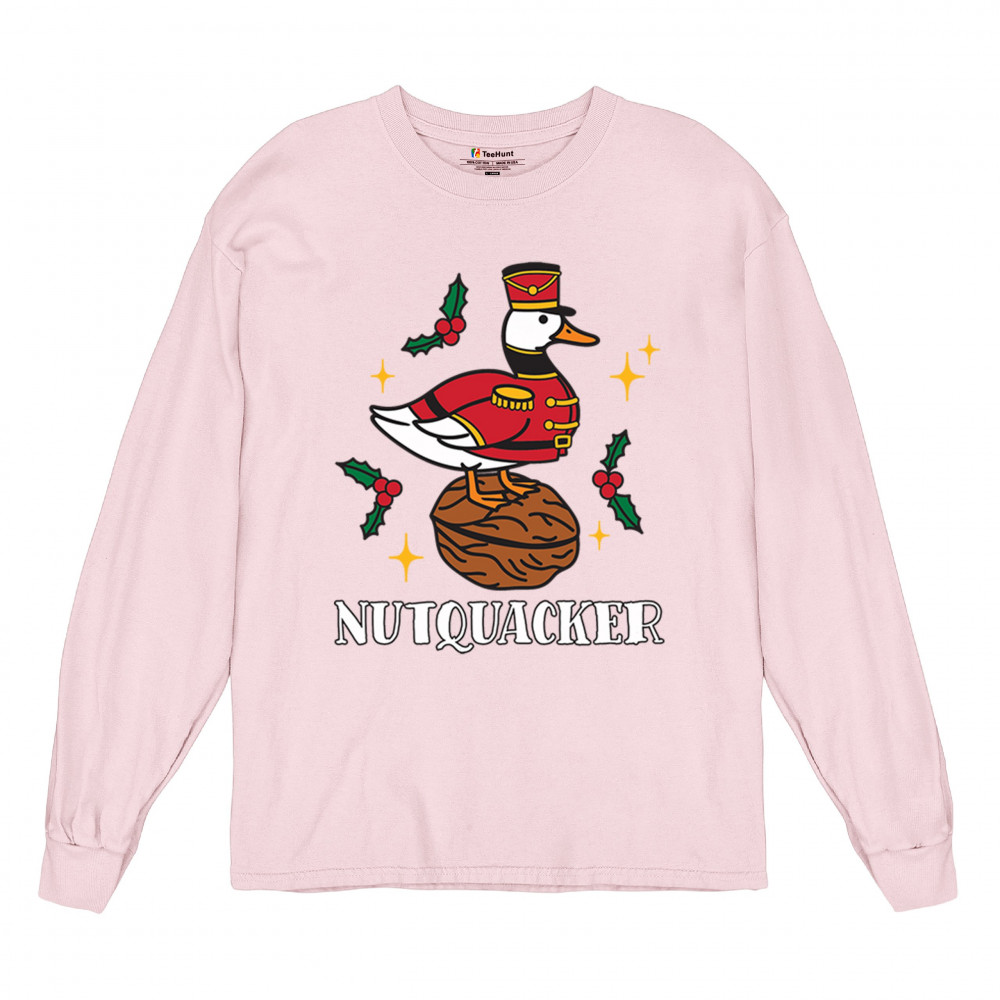 This hilarious Nutquacker design puts a festive spin on holiday humor, showcasing a duck dressed as a nutcracker standing on a walnut with holly accents and bright Christmas touches. A perfect choice for quirky gift-givers, holiday party outfits, and anyone who loves clever Christmas graphics that add personality, charm, and seasonal fun to their celebrations.
