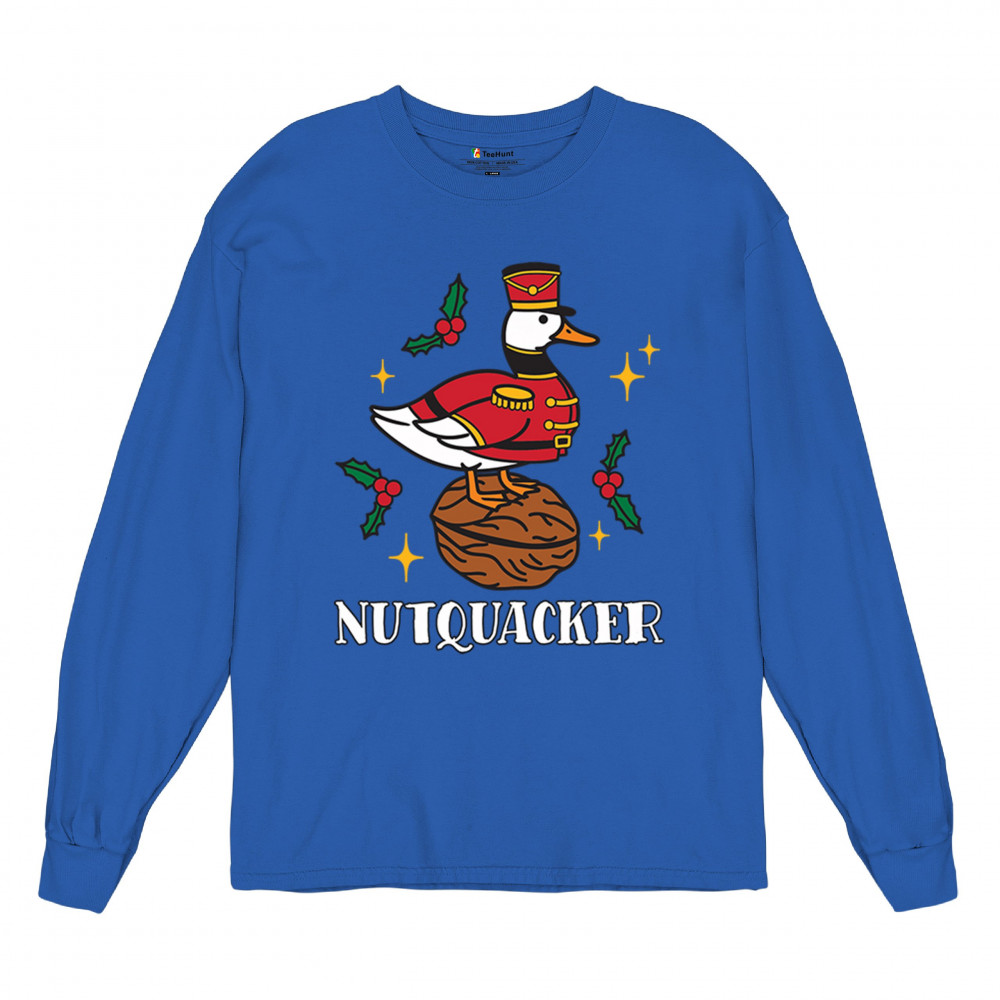 This hilarious Nutquacker design puts a festive spin on holiday humor, showcasing a duck dressed as a nutcracker standing on a walnut with holly accents and bright Christmas touches. A perfect choice for quirky gift-givers, holiday party outfits, and anyone who loves clever Christmas graphics that add personality, charm, and seasonal fun to their celebrations.