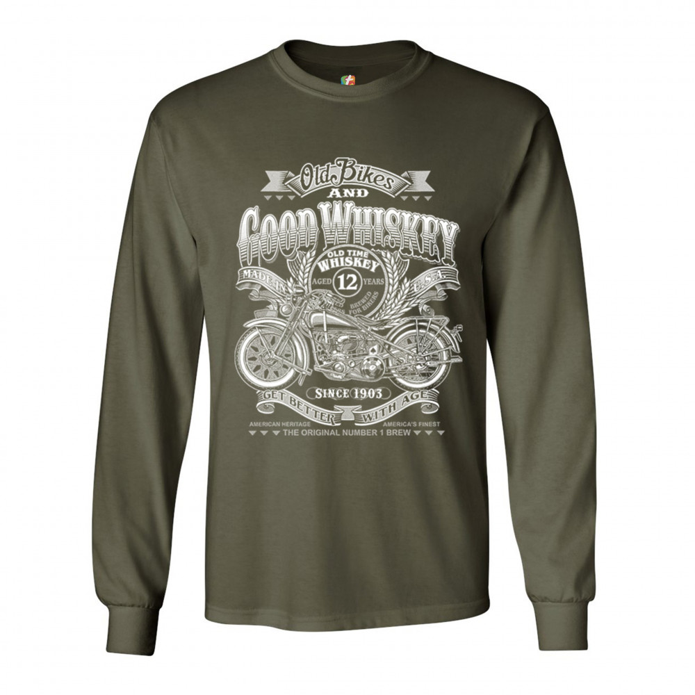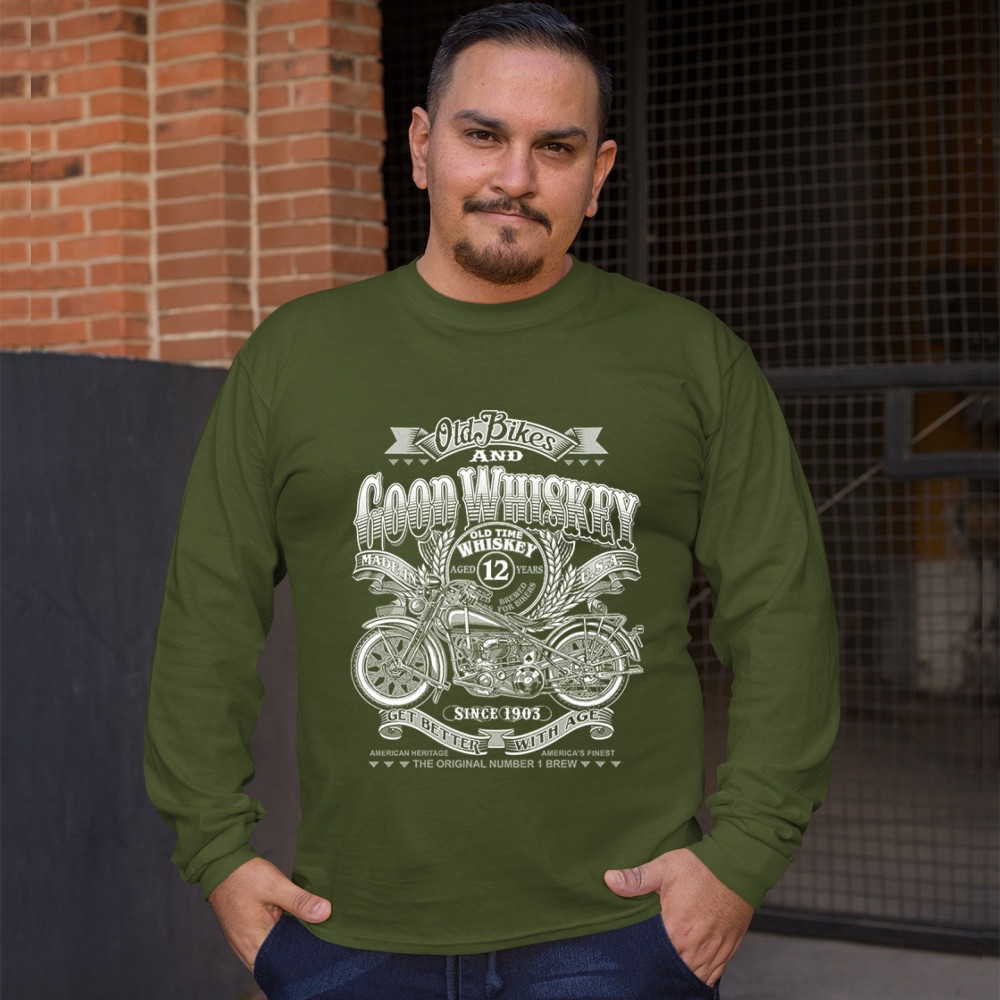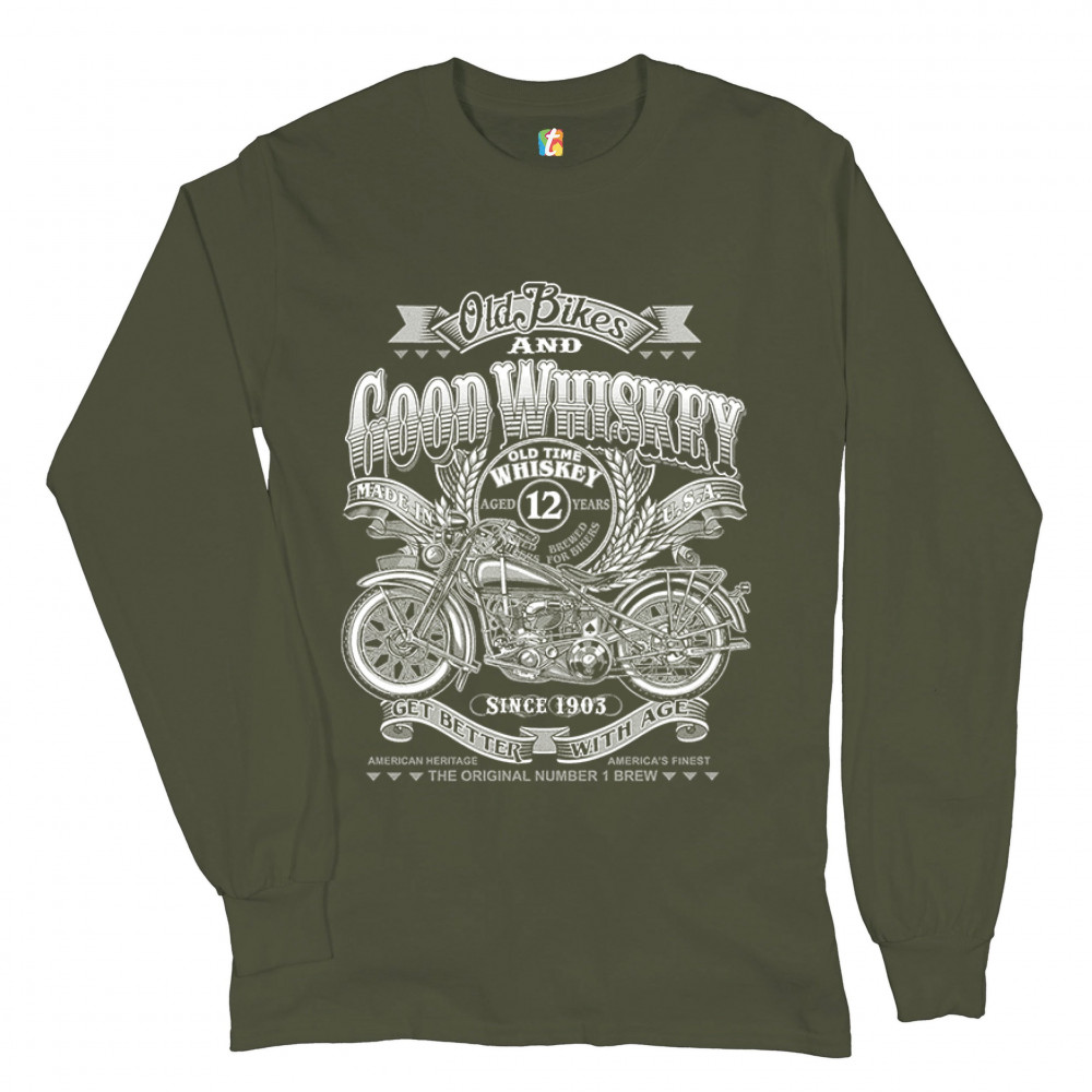 OLD BIKES AND GOOD WHISKEY long sleeve t-shirt route 66 motorcycle old school military green
