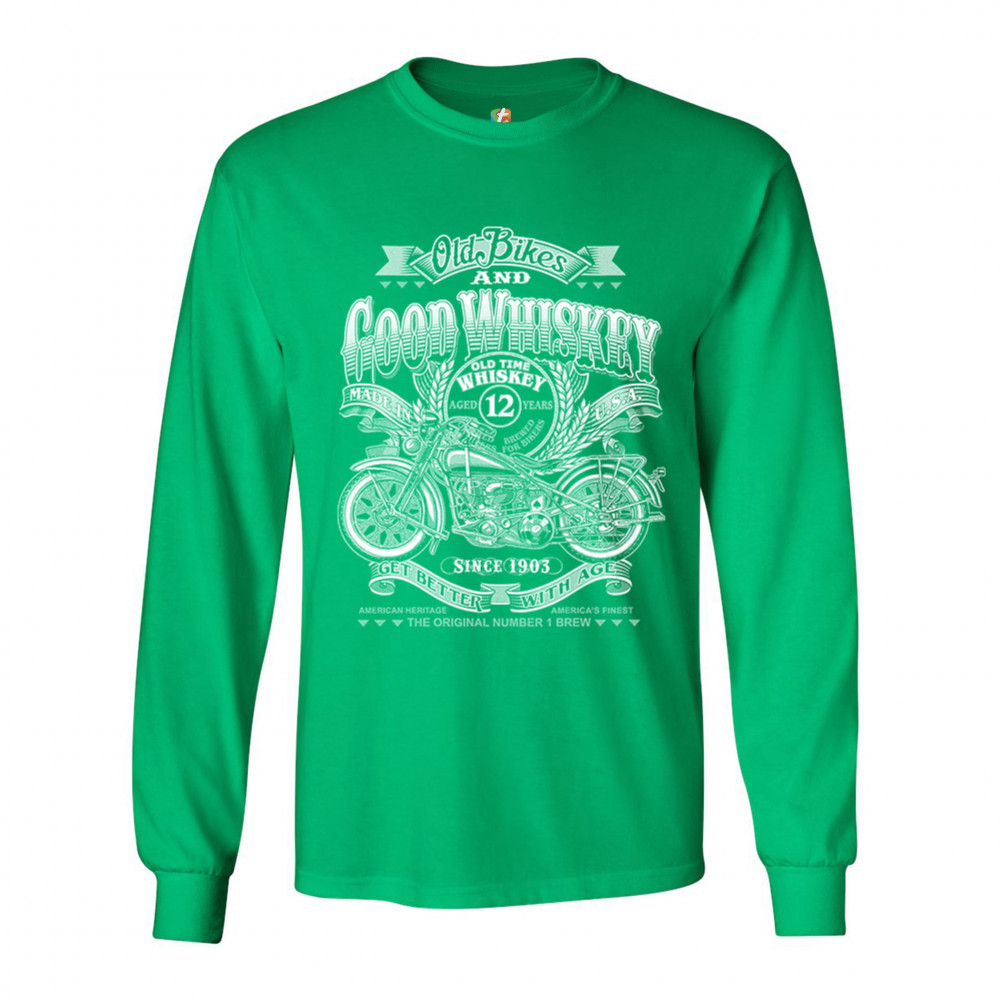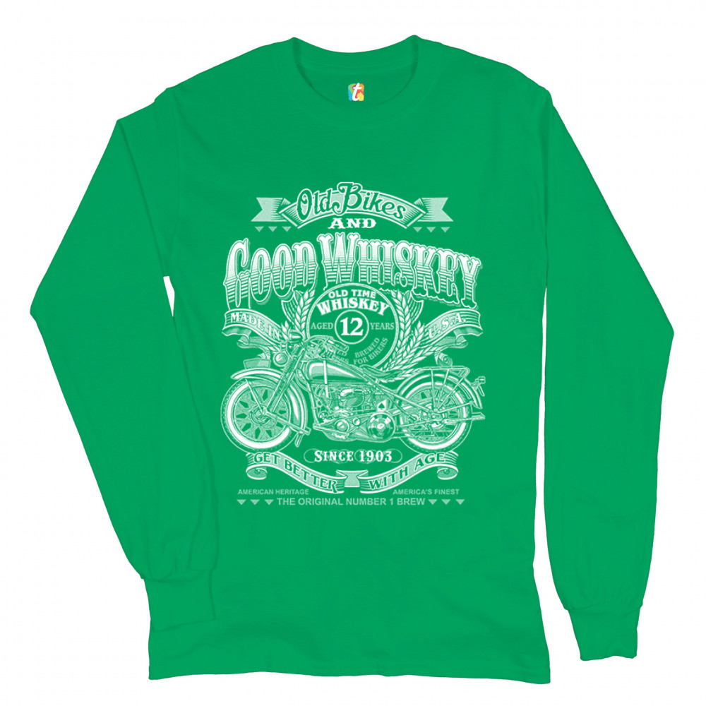 A print featuring a retro motorcycle. The print says: "Old bikes and good whiskey. Since 1903. Get better with age". In the center of the print there is a badge that says: "Old time whiskey, aged 12 years, brewed for bikers. Made in U.S.A". A great choice