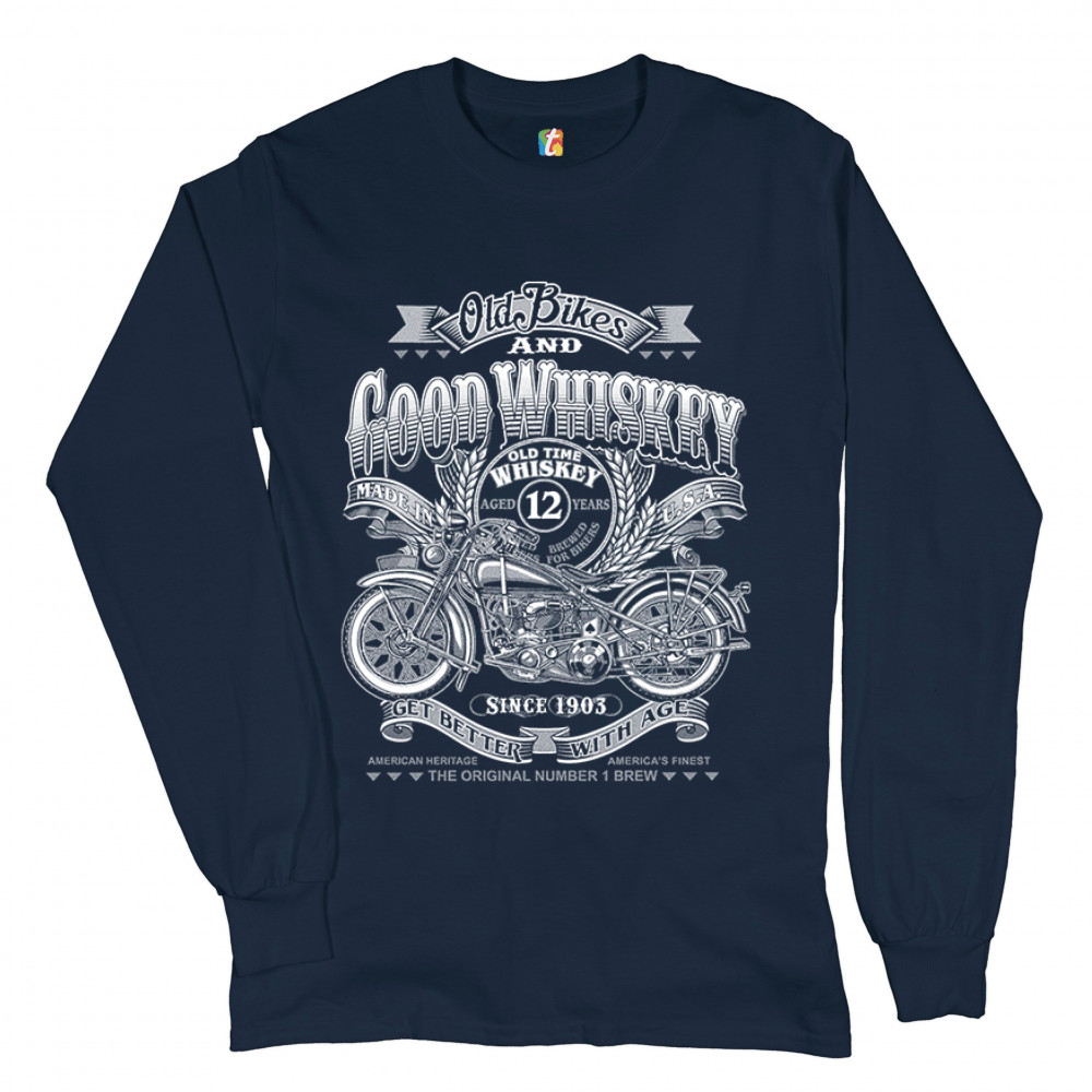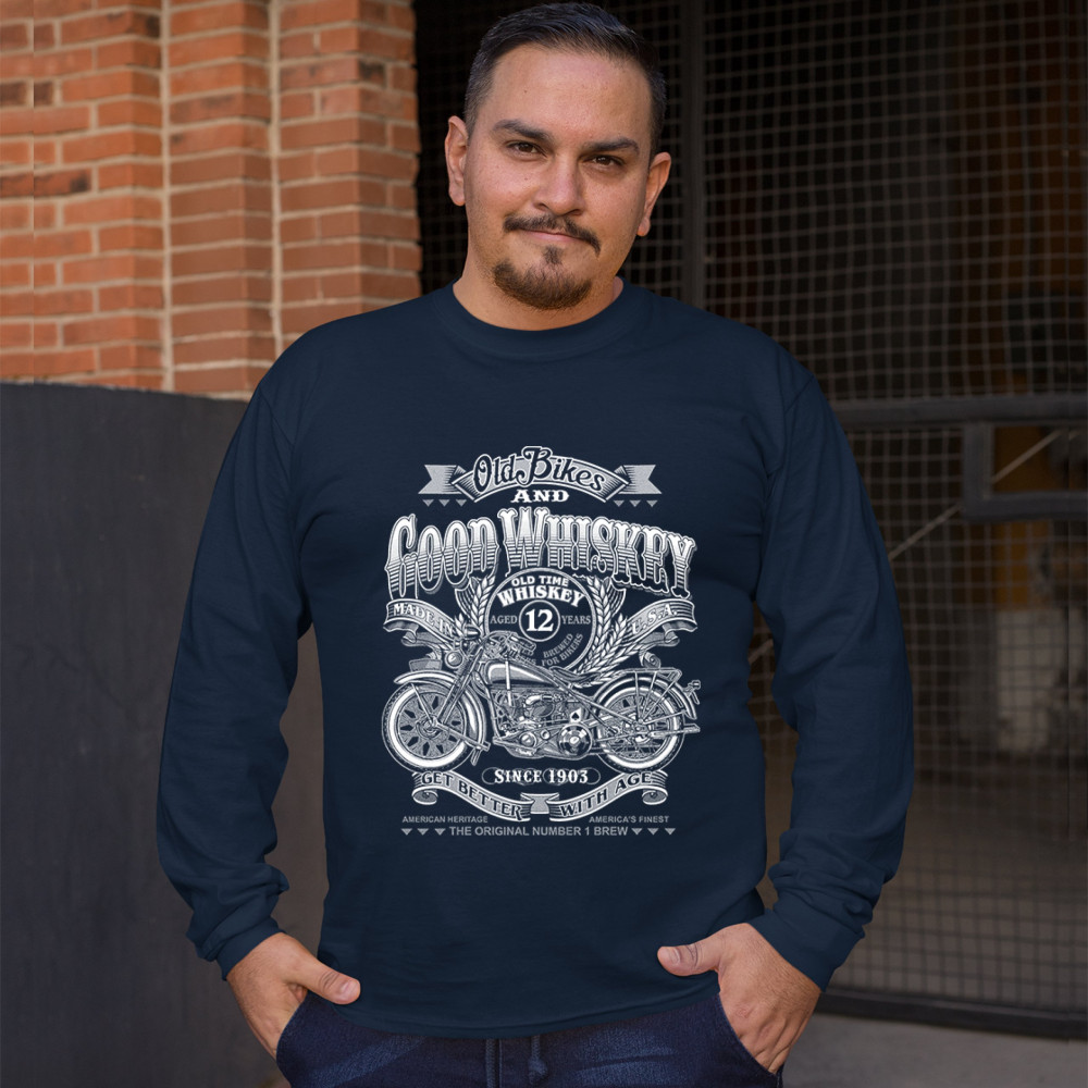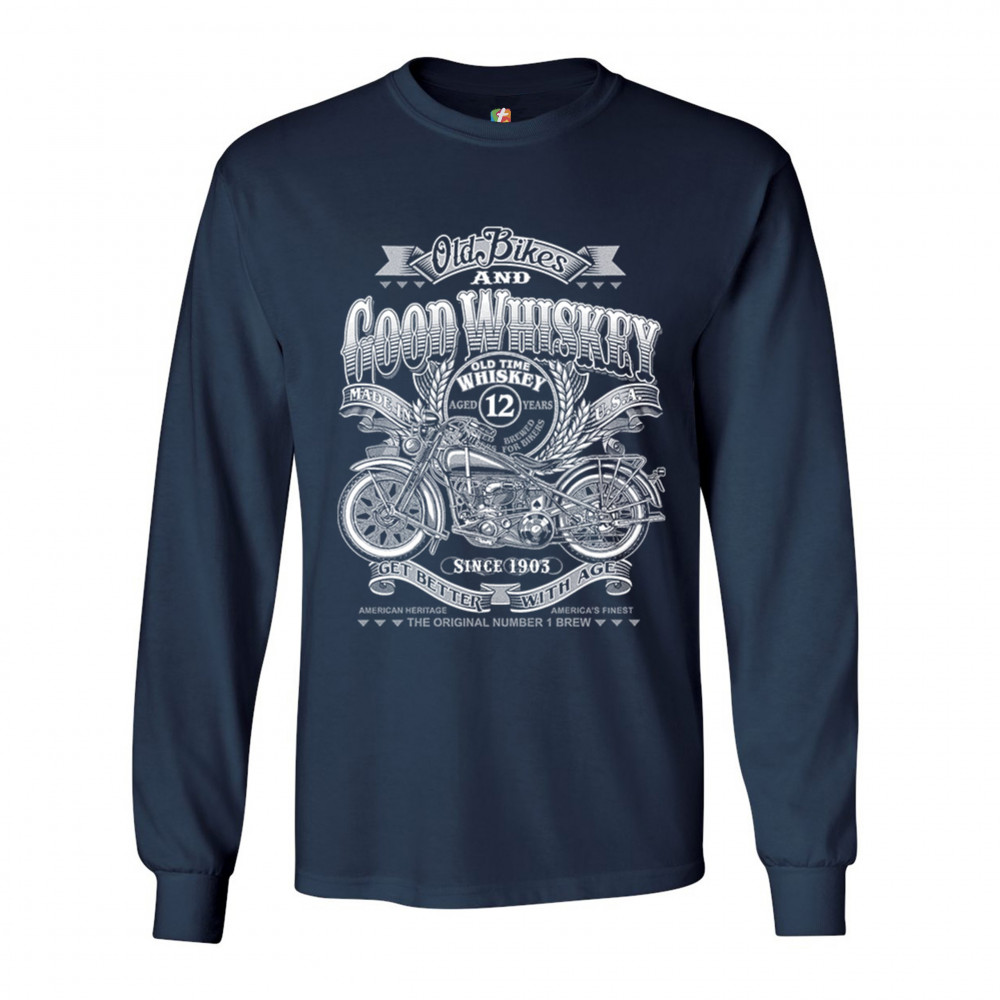 OLD BIKES AND GOOD WHISKEY long sleeve t-shirt route 66 motorcycle old school navy blue
