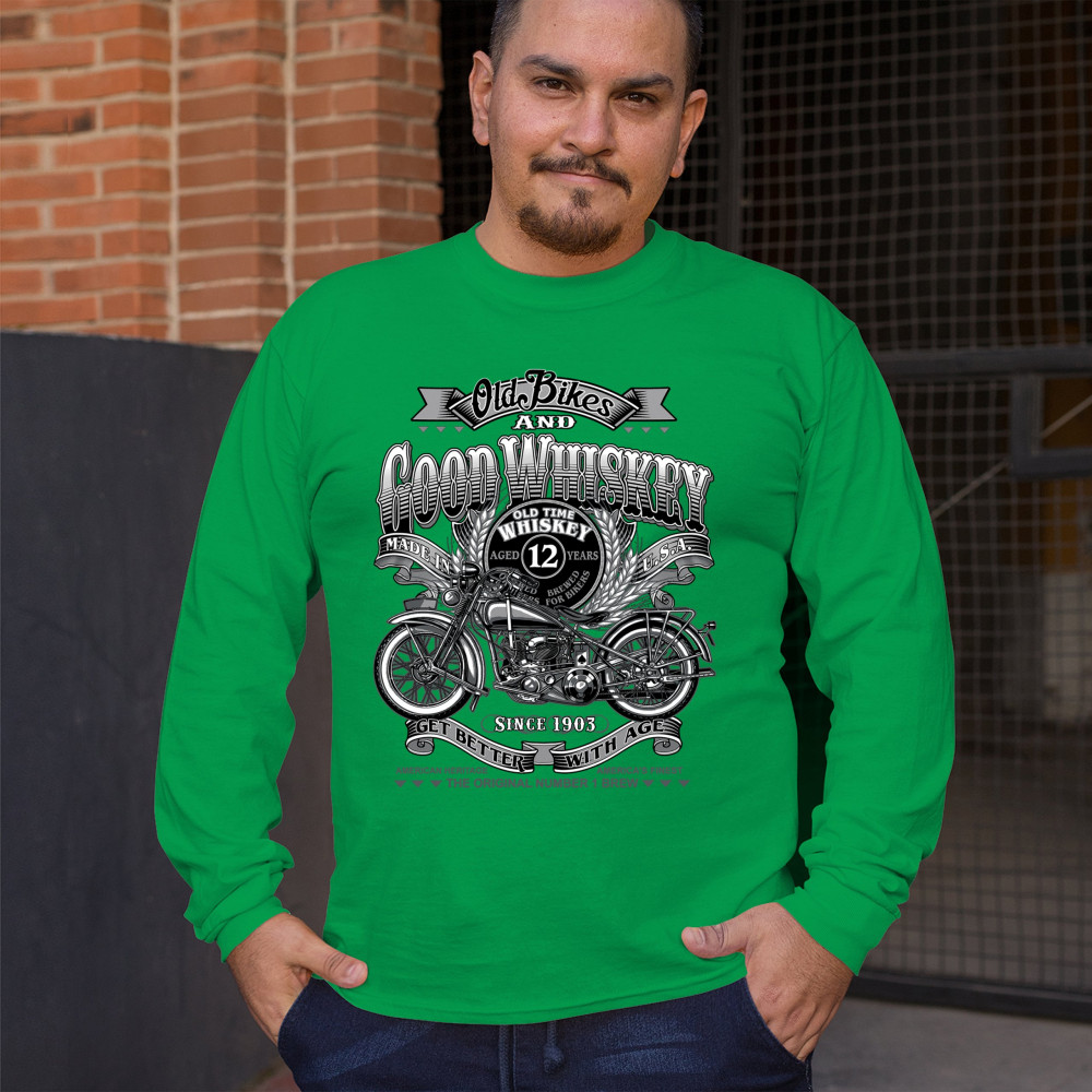 Vintage design with old bike, 12-year whiskey label, and 1903 tribute—perfect for bikers who ride hard and sip slow.