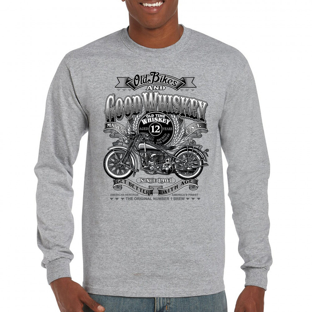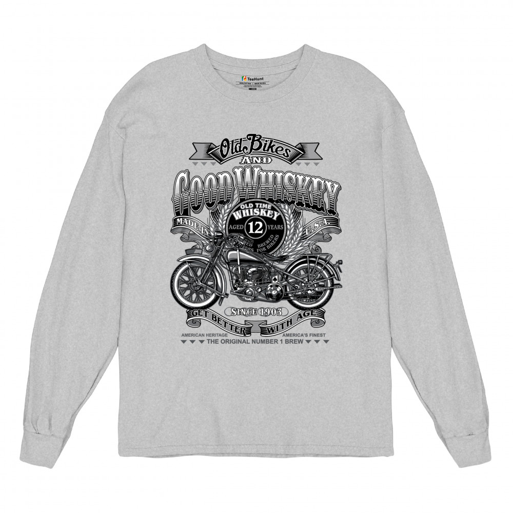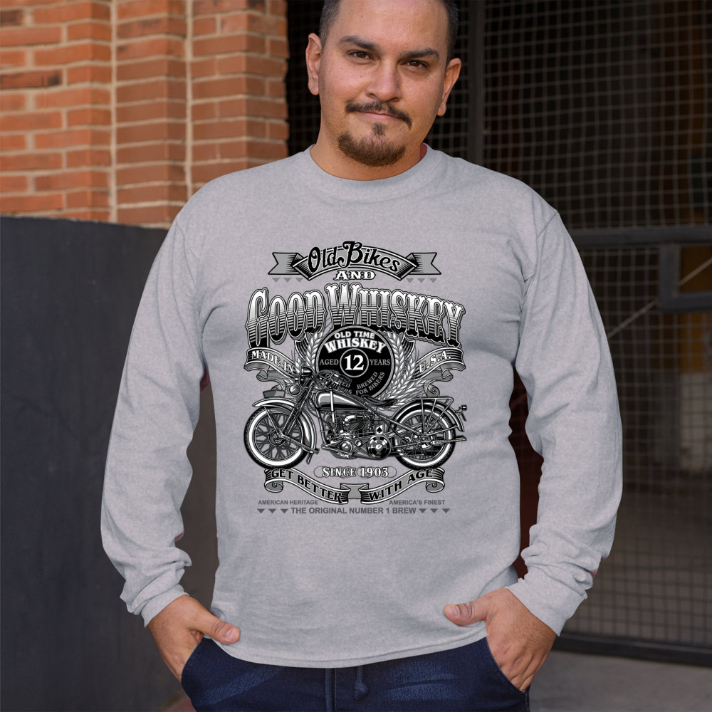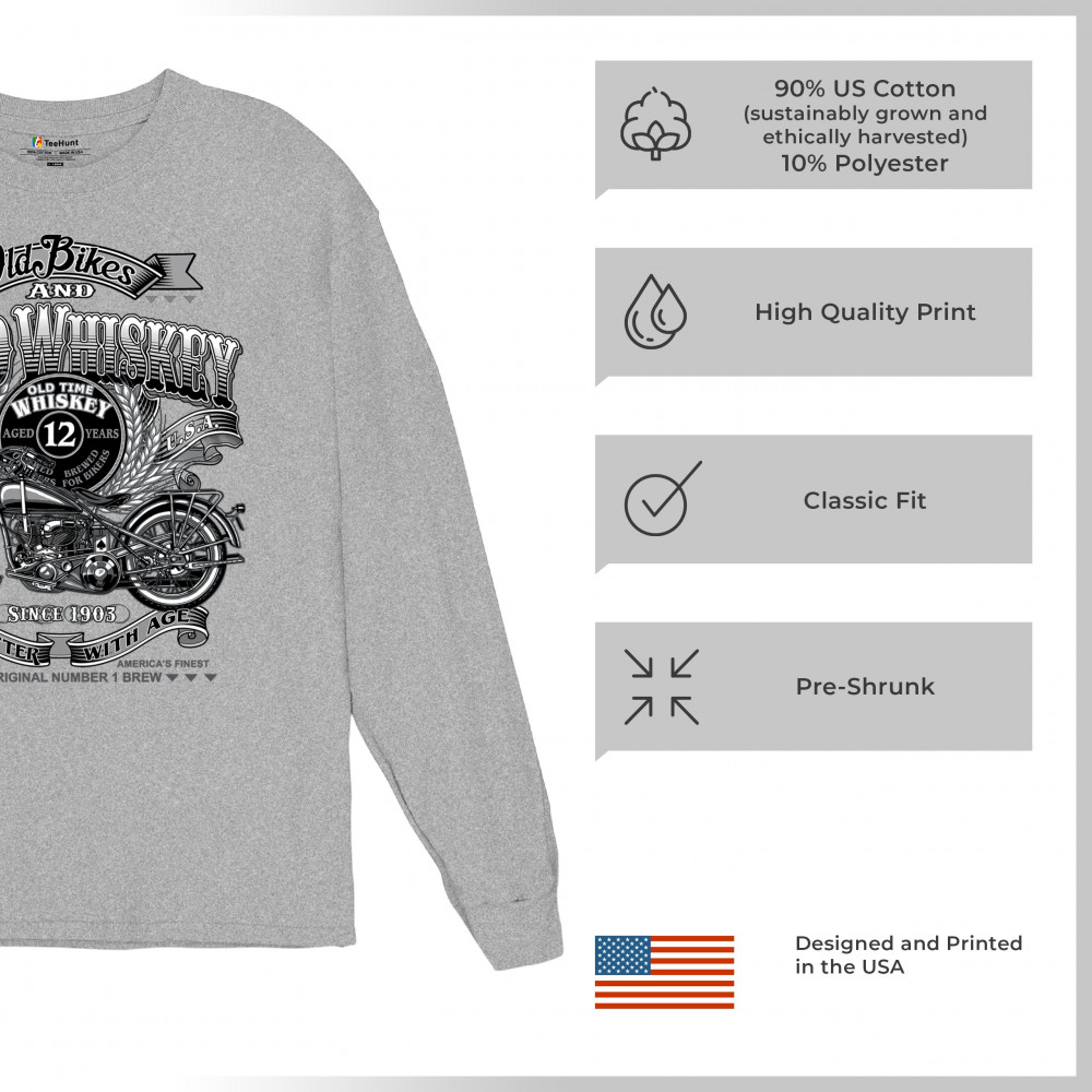 Vintage design with old bike, 12-year whiskey label, and 1903 tribute—perfect for bikers who ride hard and sip slow.