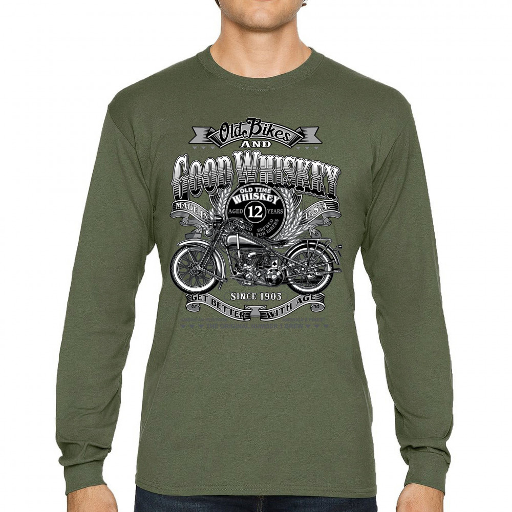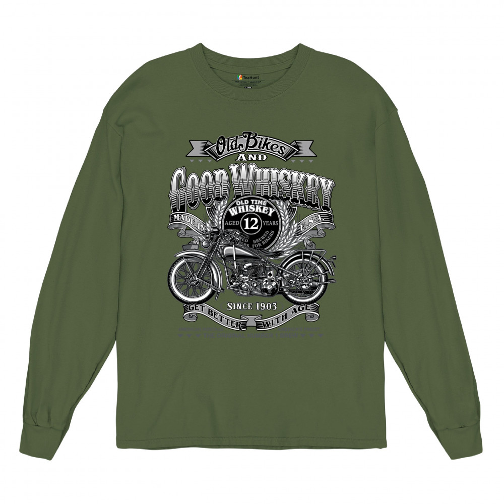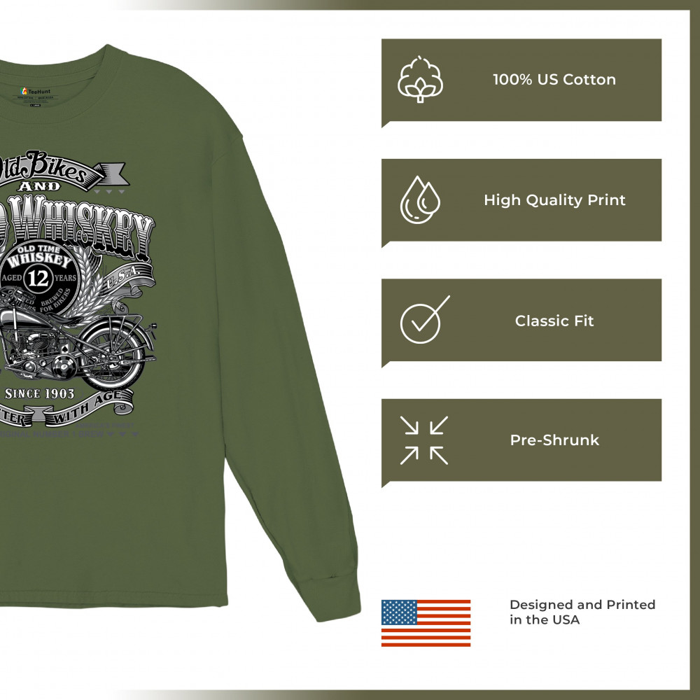Vintage design with old bike, 12-year whiskey label, and 1903 tribute—perfect for bikers who ride hard and sip slow.