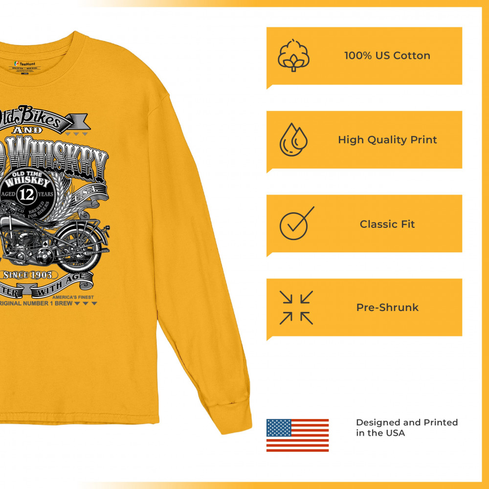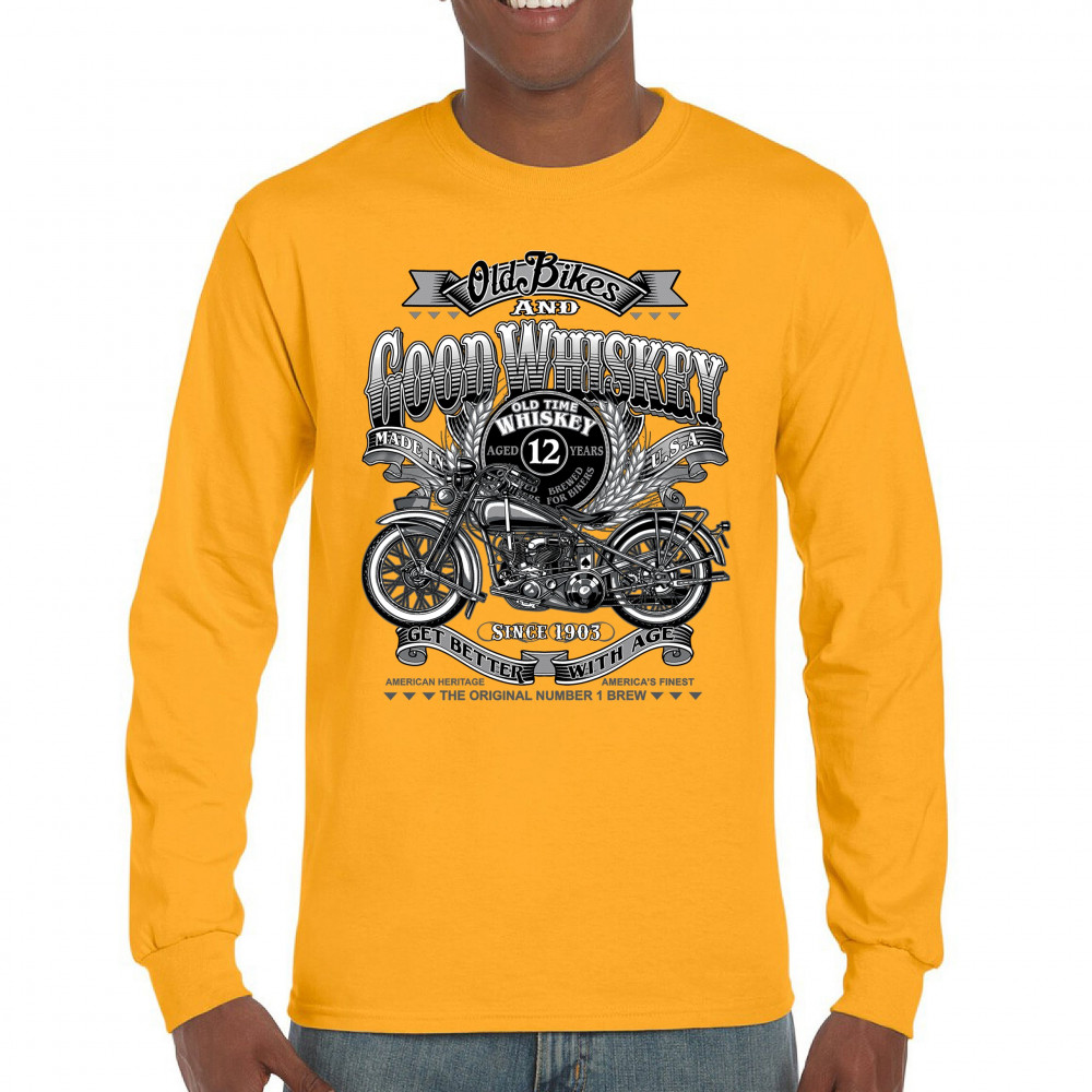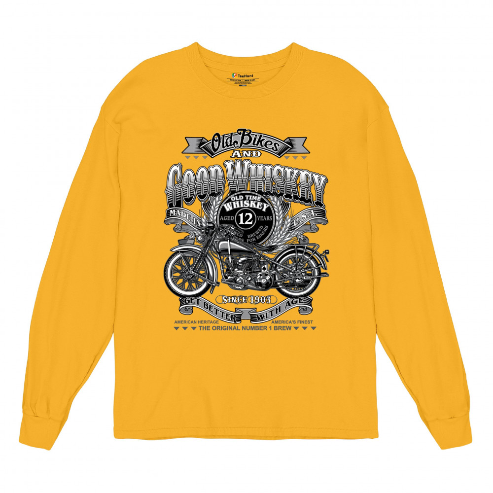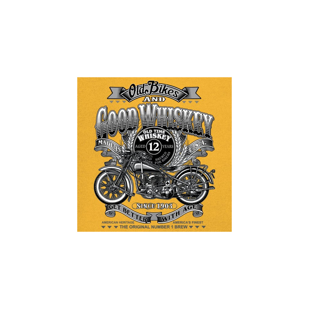Vintage design with old bike, 12-year whiskey label, and 1903 tribute—perfect for bikers who ride hard and sip slow.