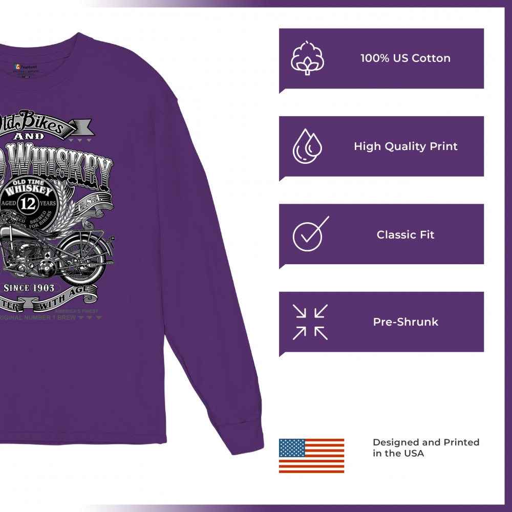 Vintage design with old bike, 12-year whiskey label, and 1903 tribute—perfect for bikers who ride hard and sip slow.