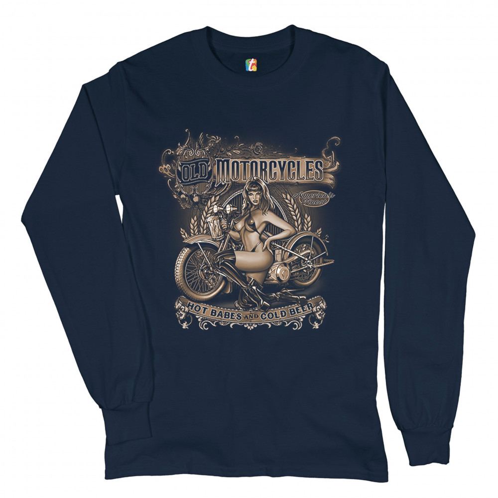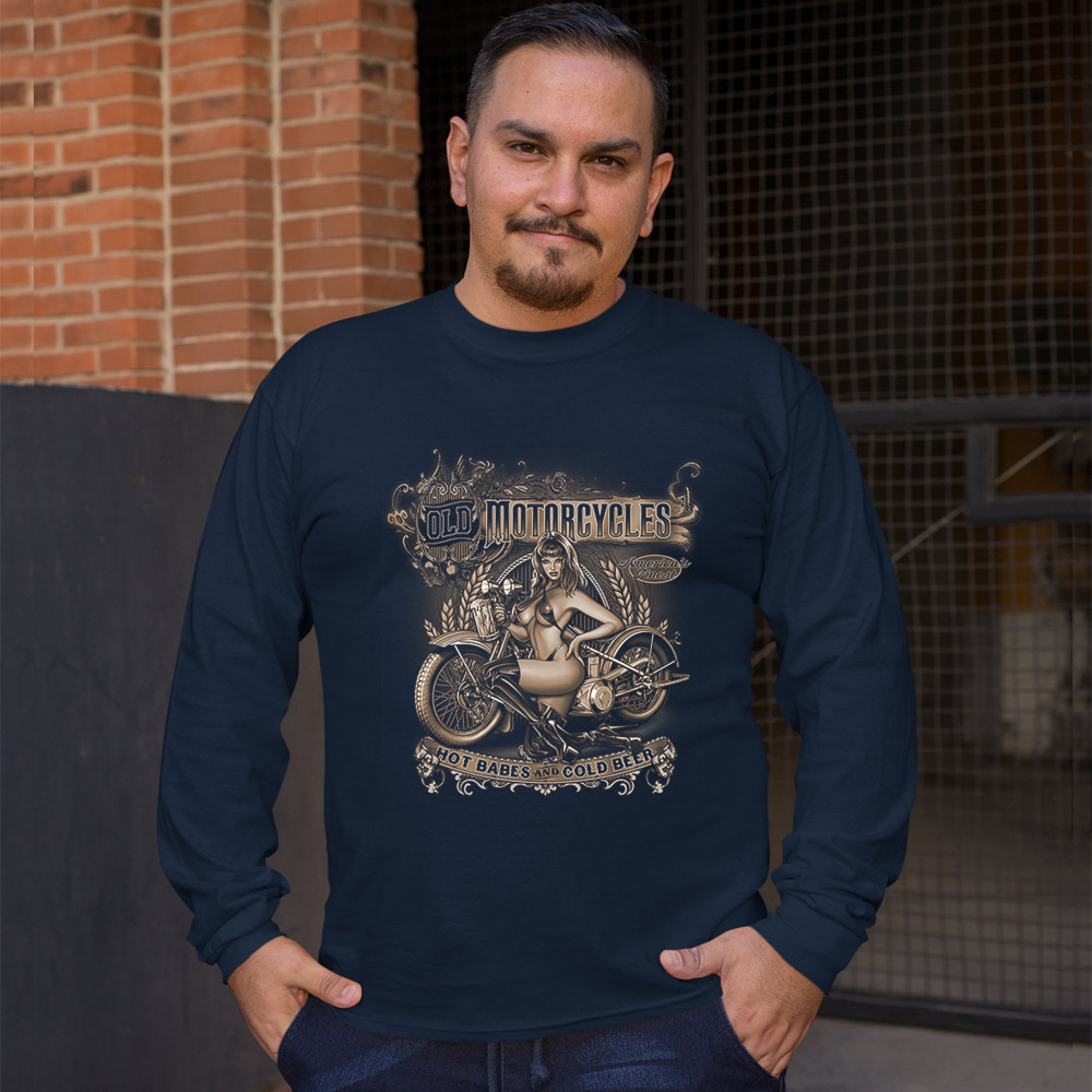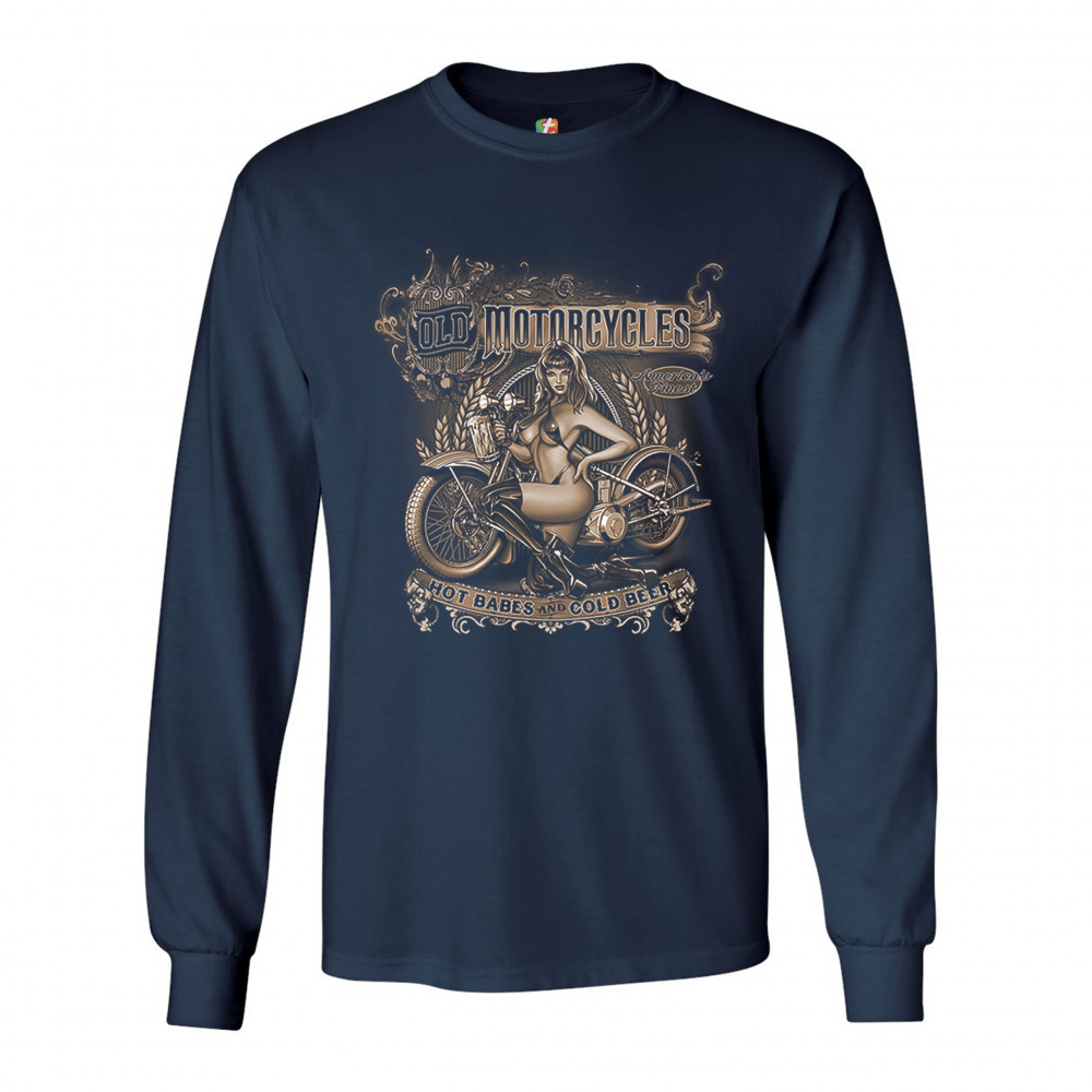 OLD MOTORCYCLES HOT BABES AND COLD BEER long sleeve t-shirt biker babe chopper navy blue