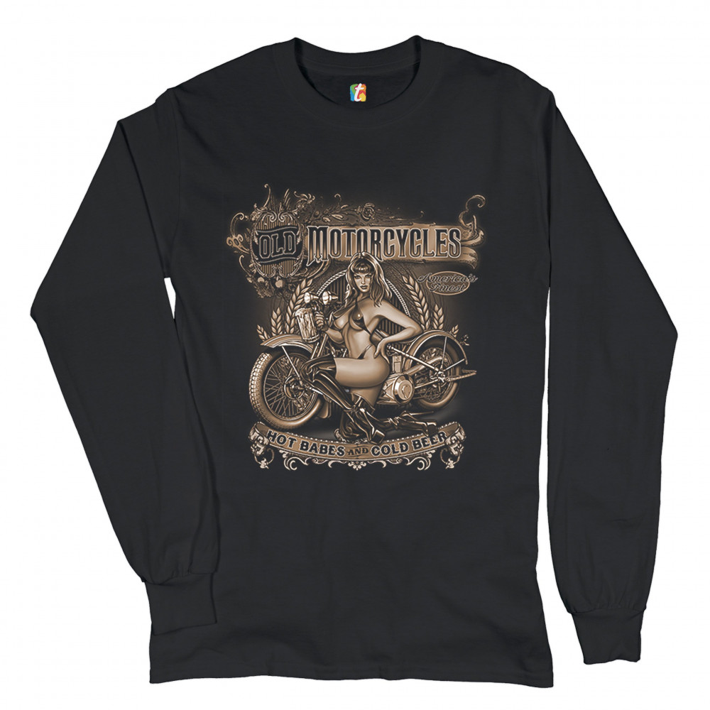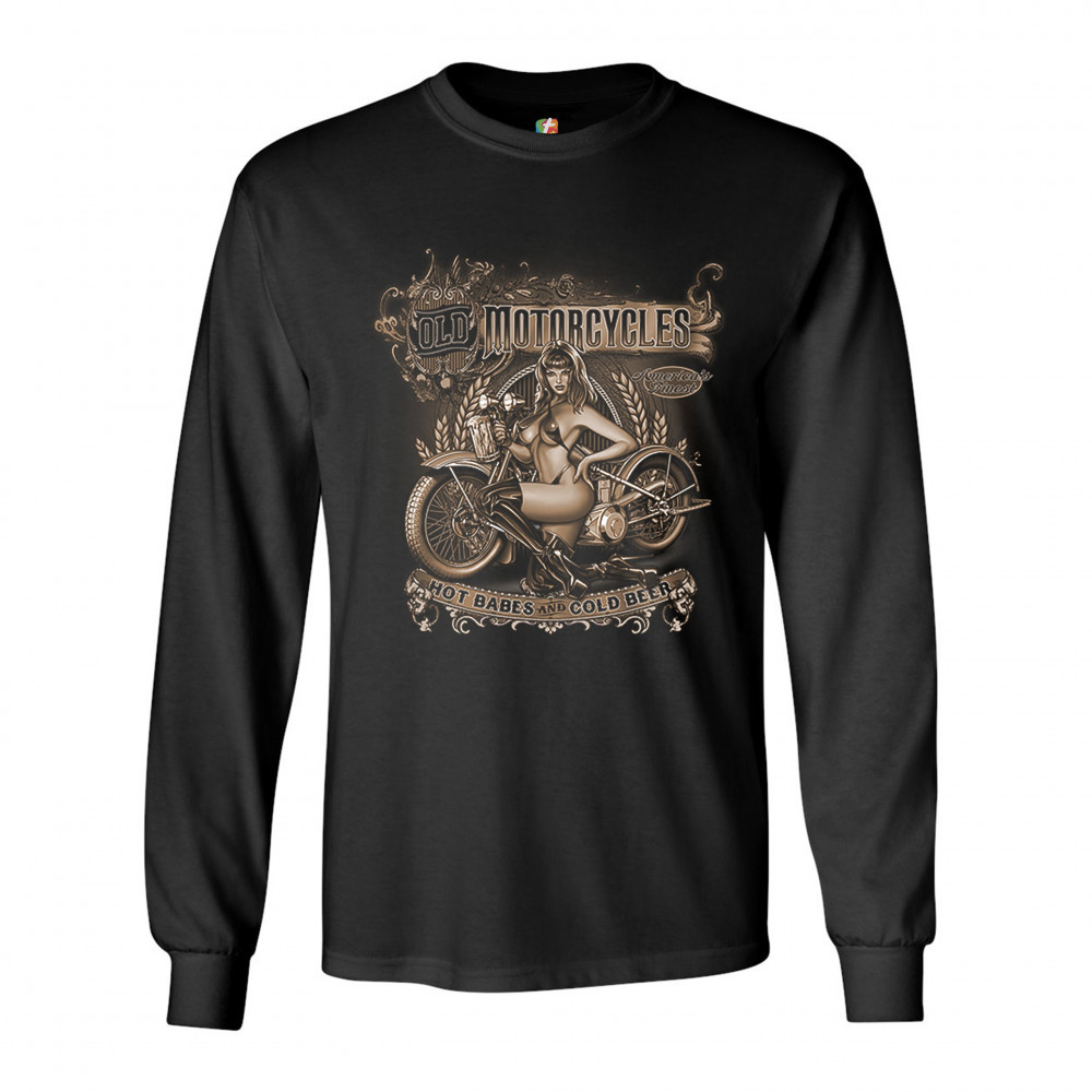OLD MOTORCYCLES HOT BABES AND COLD BEER long sleeve t-shirt biker babe chopper black