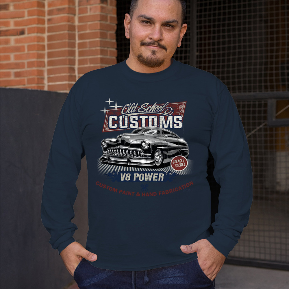 Celebrate classic automotive culture with our "Old School Customs" t-shirt, featuring a V8 power design. Perfect for car enthusiasts and fans of vintage rides.