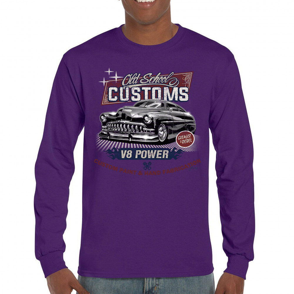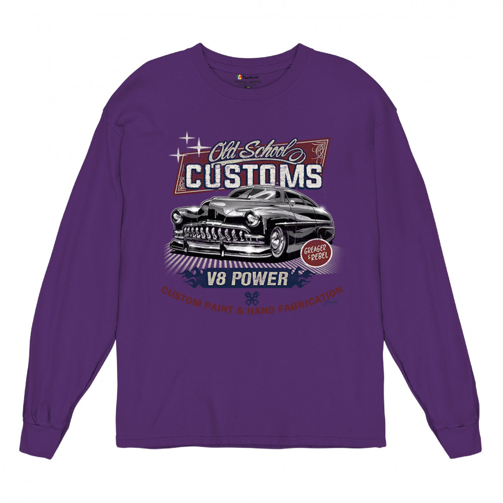 Celebrate classic automotive culture with our "Old School Customs" t-shirt, featuring a V8 power design. Perfect for car enthusiasts and fans of vintage rides.