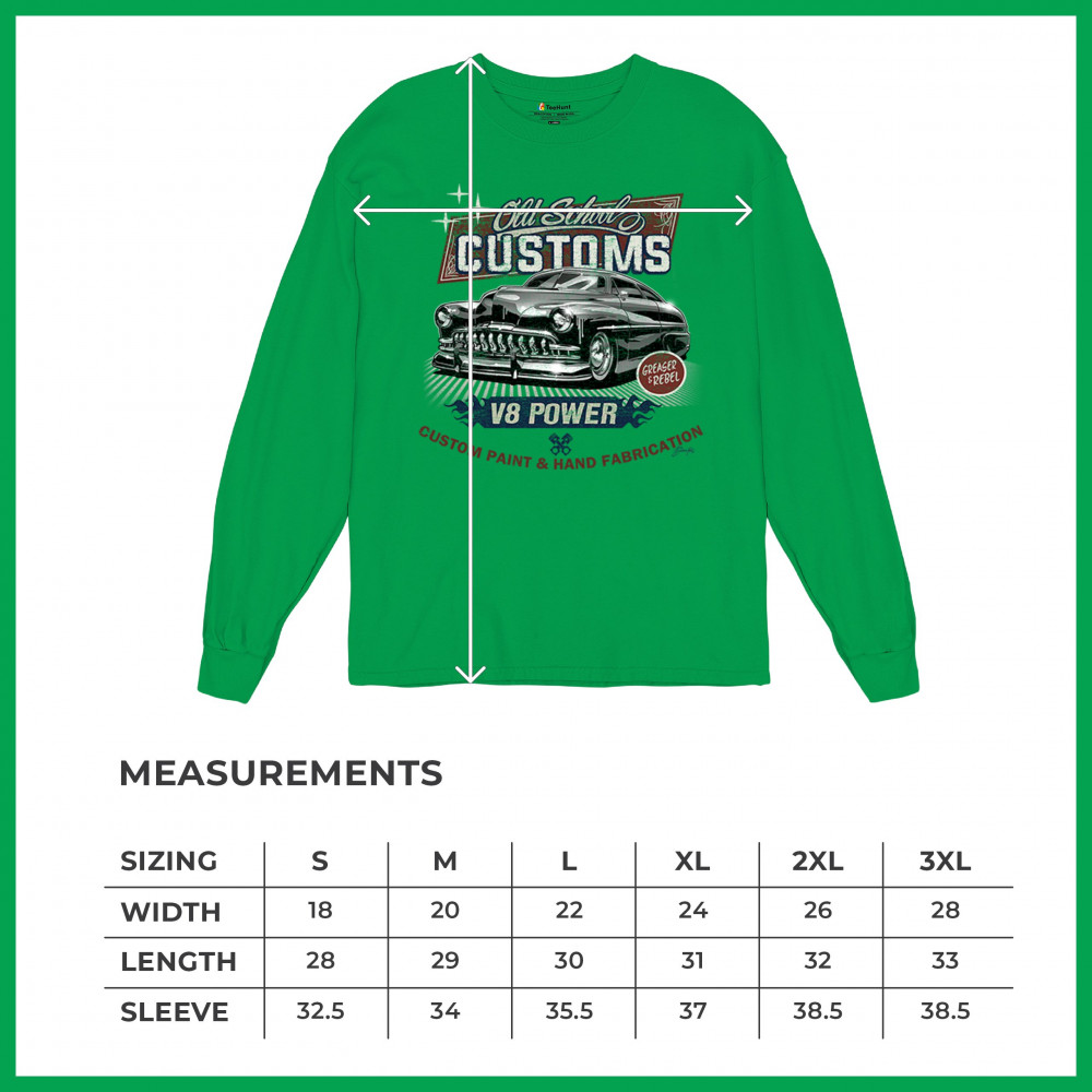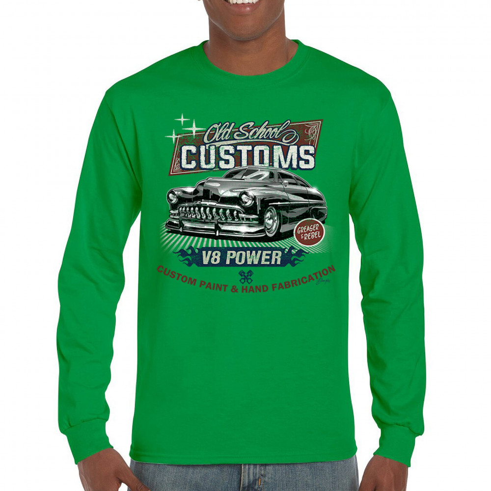 Celebrate classic automotive culture with our "Old School Customs" t-shirt, featuring a V8 power design. Perfect for car enthusiasts and fans of vintage rides.