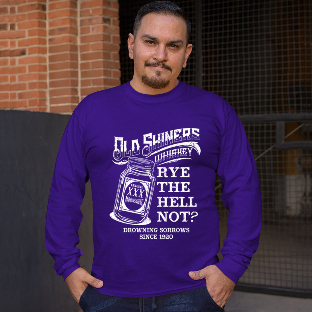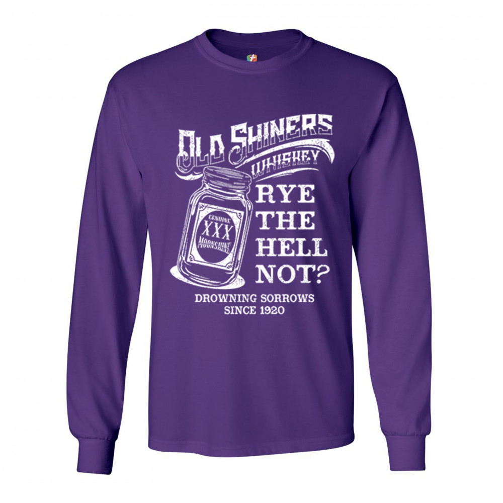 OLD SHINERS WHISKEY long sleeve t-shirt rye the hell not? old school drinking purple