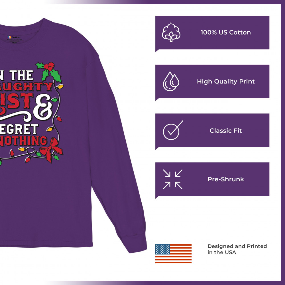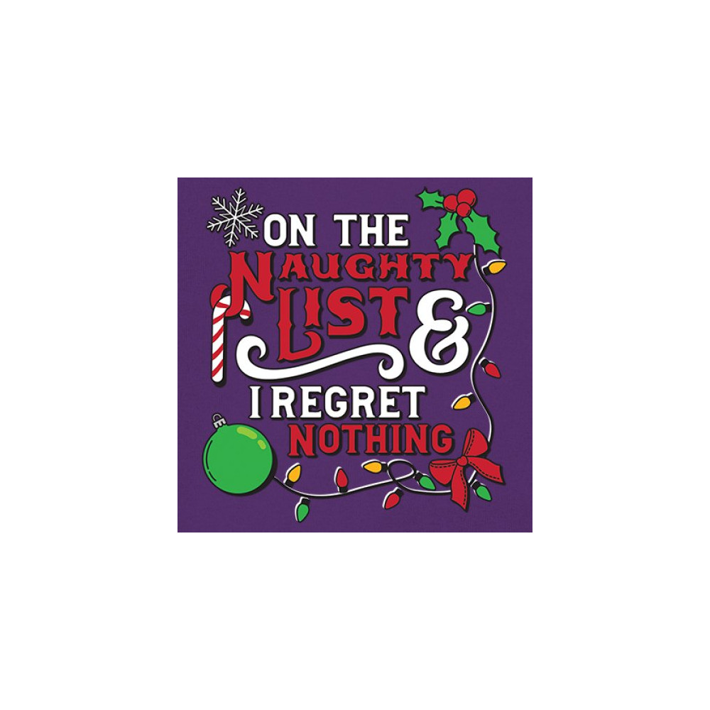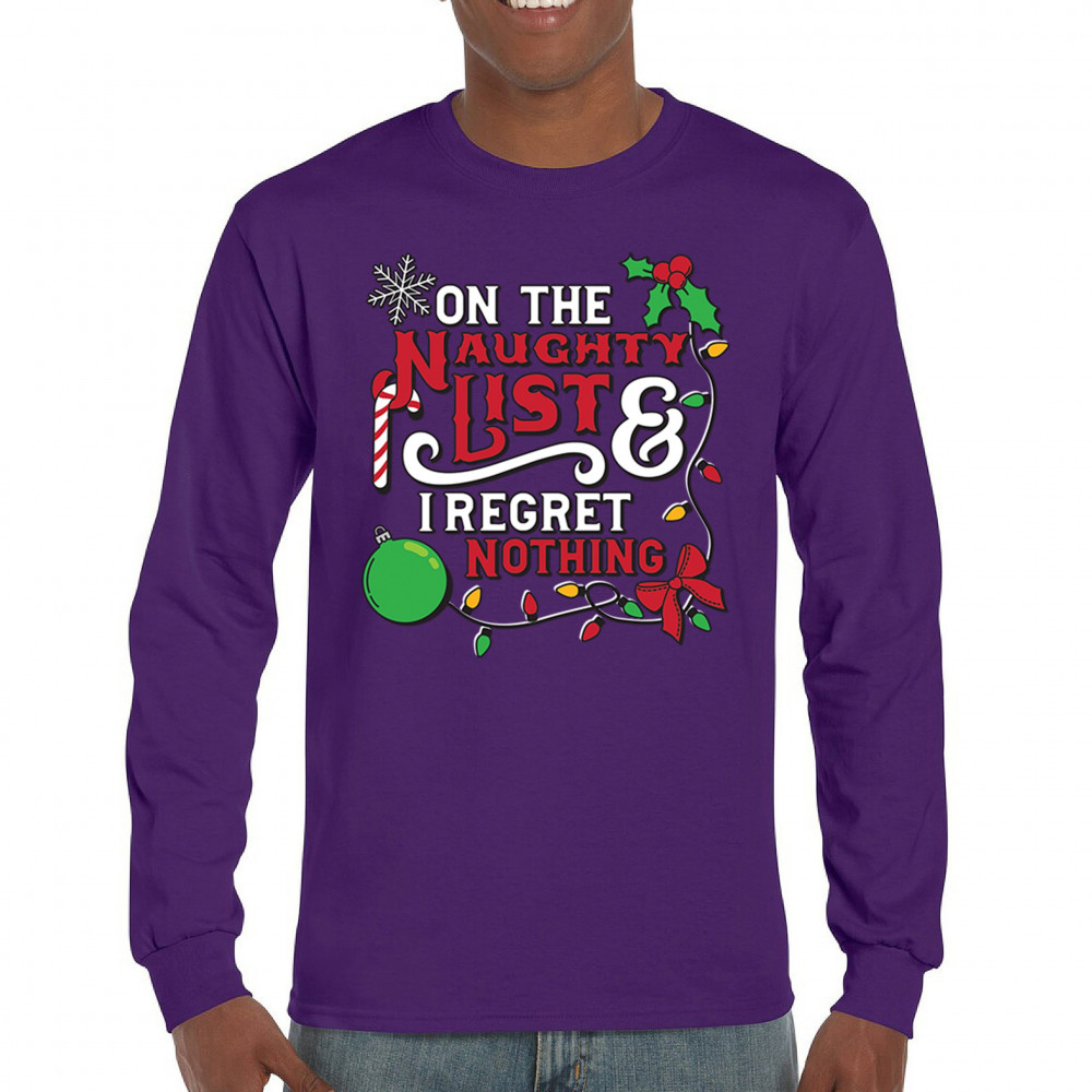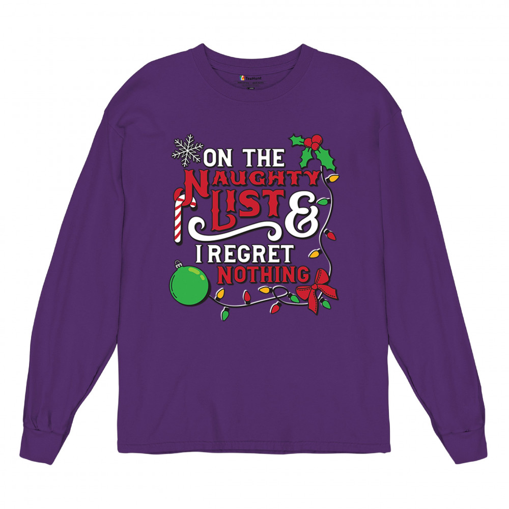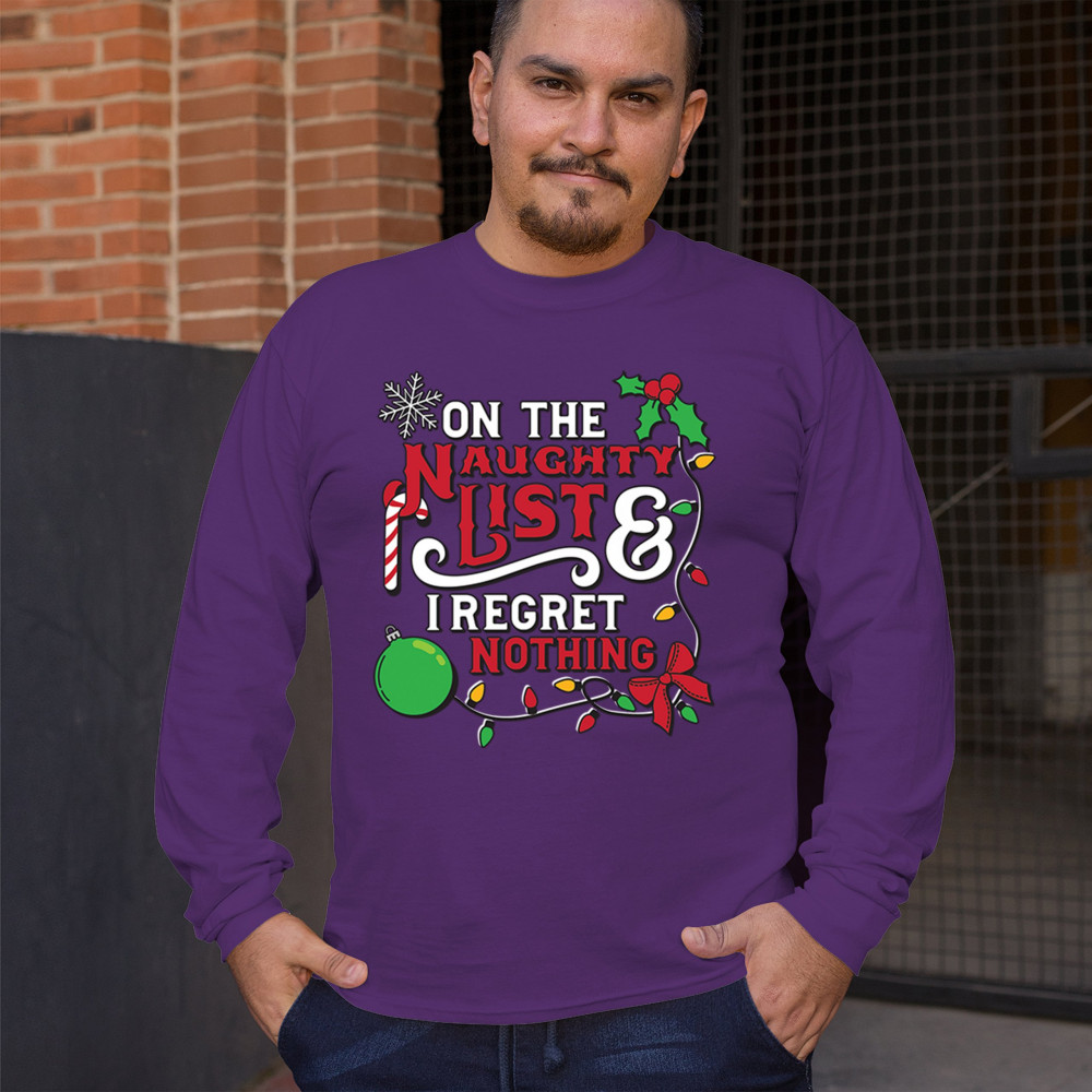 Celebrate the holidays with the playful “Naughty List & I Regret Nothing†design. Perfect for festive gatherings, ugly sweater parties, and holiday fun!