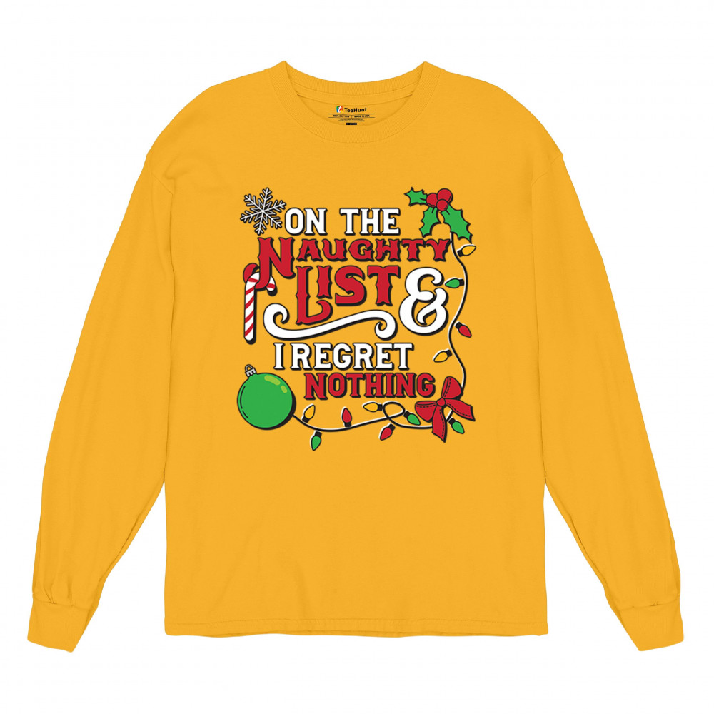 Express your holiday spirit with humor through the "Naughty List & I Regret Nothing" design, a perfect companion for Christmas celebrations, gift exchanges, or festive family gatherings. It adds a touch of playfulness to your winter wardrobe while spreading joy and laughter. Ideal for pairing with an ugly sweater or cozy holiday apparel, it’s the ultimate way to stay jolly and carefree throughout the season.