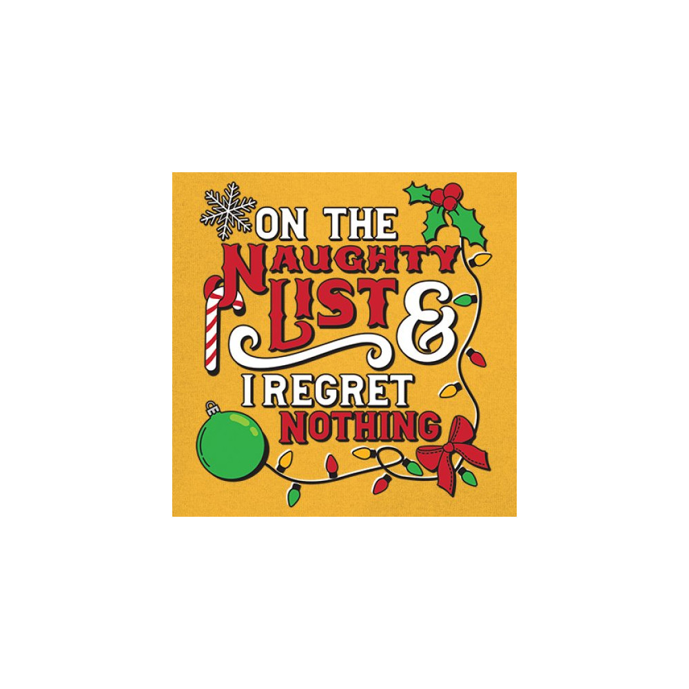 Celebrate the holidays with the playful “Naughty List & I Regret Nothing†design. Perfect for festive gatherings, ugly sweater parties, and holiday fun!