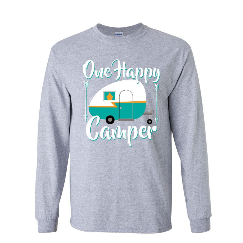 ONE HAPPY CAMPER long sleeve t-shirt camping roadtrip rv trailer tee gray